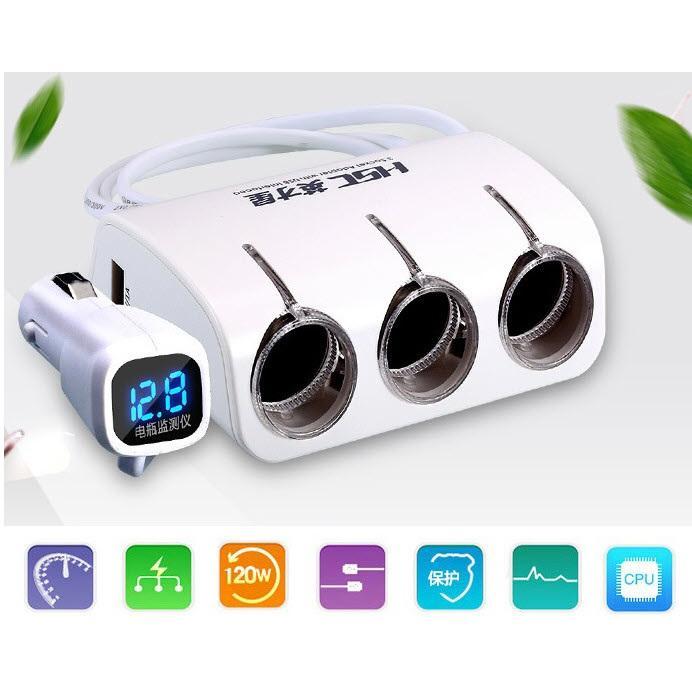 ✨Chia tẩu Ô tô 1 ra 3 công suất 120W có cổng sạc USB và báo điện áp