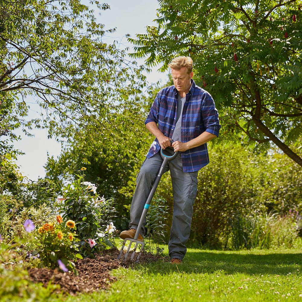 Chĩa trồng cây cán dài 117cm Gardena 17013-20 thích hợp để đào tơi xốp đất ngay cả trong các khu vực có cây trồng mà không làm hỏng rễ cây.