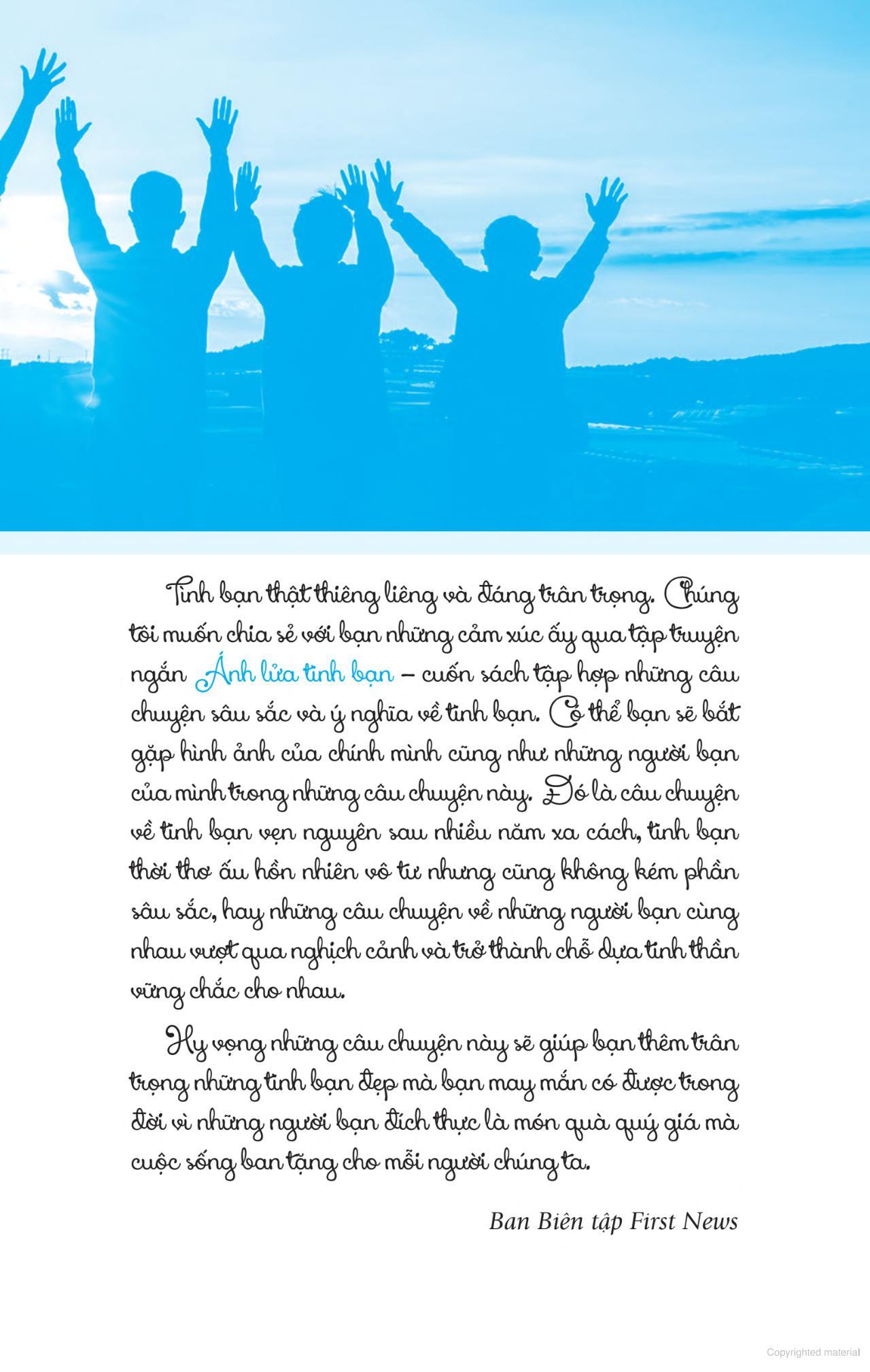 Tình bạn thật thiêng liêng và đáng trân trọng. Chúng tôi muốn chia sẻ với bạn những cảm xúc ấy qua tập truyện ngắn Ánh lửa tình bạn – cuốn sách tập hợp những câu chuyện sâu sắc và ý nghĩa về tình bạn. Có thể bạn sẽ bắt gặp hình ảnh của chính m.ình cũng như những người bạn của m.ình trong những câu chuyện này. Đó là câu chuyện về tình bạn vẹn nguyên sau nhiều năm xa cách, là tình bạn thời thơ ấu hồn nhiên vô tư nhưng cũng không kém phần sâu sắc, hay những câu chuyện về những người bạn cùng vượt qua nghịch cảnh và trở thành chỗ dựa tinh thần vững chắc cho nhau.