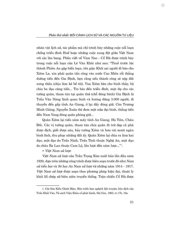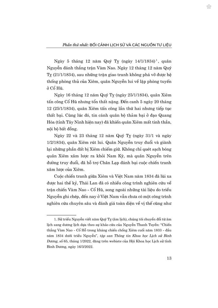 Vào nửa đầu thế kỷ XIX, trong bối cảnh khu vực Đông Nam Á có nhiều chuyển biến phức tạp, Việt Nam đã đương đầu với một cuộc chiến tranh xâm lược mới từ phía Tây của Tổ quốc. Phát huy truyền thống yêu nước đánh giặc giữ nước của dân tộc, dưới sự trị vì của vua Minh Mệnh, quân và dân Việt Nam đã tiến hành cuộc chiến tranh tự vệ, bảo vệ Tổ quốc và làm nên Chiến thắng Vàm Nao - Cổ Hũ đầu năm 1834, mở ra bước ngoặt phát triển dẫn đến kết thúc thắng lợi cuộc kháng chiến chống quân Xiêm xâm lược. Chiến thắng Vàm Nao - Cổ Hũ (1834) thực sự là một trong những chiến công lừng lẫy trong lịch sử chống ngoại xâm của dân tộc trong thế kỷ XIX.