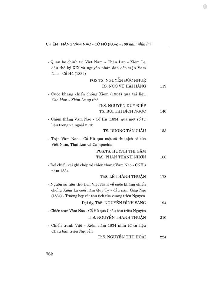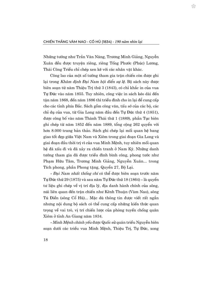 Nhằm góp phần làm rõ giá trị và ý nghĩa lịch sử của Chiến thắng Vàm Nao - Cổ Hũ trong lịch sử dân tộc Việt Nam, khơi dậy và phát huy tinh thần yêu nước, tinh thần tự hào, tự tin và tự chủ của dân tộc trong giai đoạn phát triển mới của đất nước, Nhà xuất bản Chính trị quốc gia Sự thật xuất bản cuốn sách Chiến thắng Vàm Nao - Cổ Hũ (1834) - 190 năm nhìn lại.