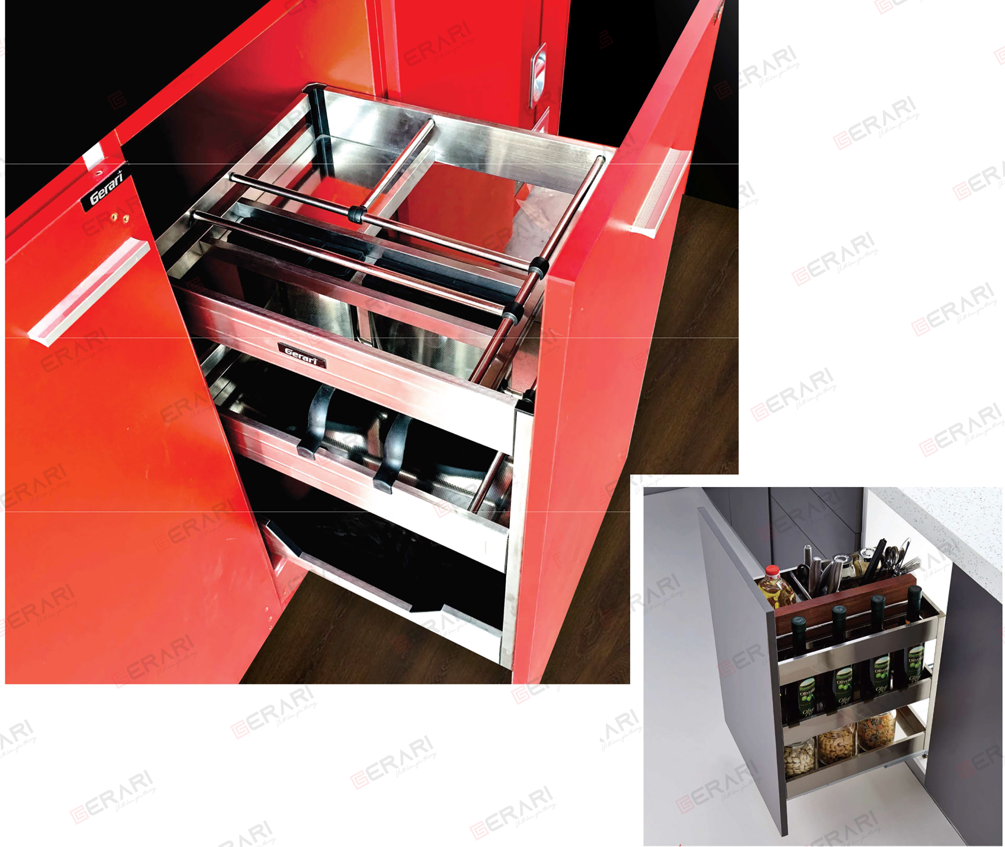 Giá đa năng để dao thớt, chai lọ, gia vị Chất liệu: inox 304 dạng nan tròn Phiên bản bát cánh ngăn kéo và mở cánh Ray âm giảm chấn Angas Độ rộng cánh: 200mm