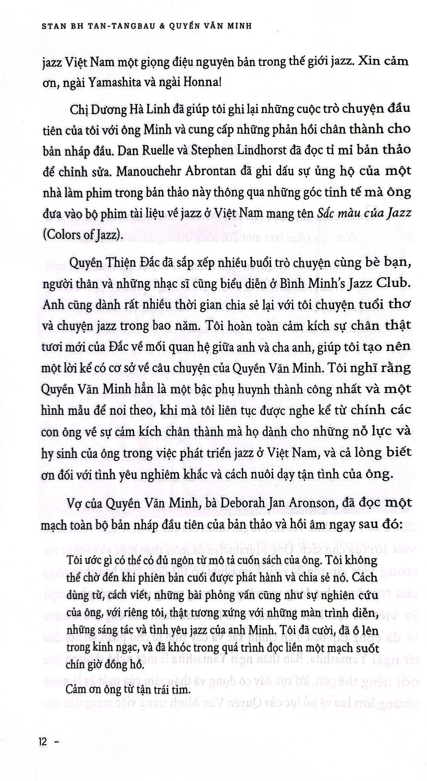 - Phát triển jazz ở Việt Nam vẫn là sứ mệnh sau cùng của tôi. THÔNG TIN TÁC GIẢ Stan BH Tan-Tangbau Tiến sĩ chuyên nghiên cứu về các câu chuyện văn hóa cũng như sự thay đổi chính trị-xã hội ở Việt Nam và khu vực miền núi khắp Đông Nam Á. Nhiều bài viết của ông được đăng trên các tạp chí như Jazz Perspectives, Collaborative Anthropologies, Journal of Narrative Politics và Journal of Vietnam Studies. Ông từng giảng dạy tại Đại học Ritsumeikan ở Kyoto và Đại học Quốc gia Singapore. Quyền Văn Minh (sinh năm 1954) Được xem là “Bố già của nhạc jazz Việt Nam”, ông không chỉ là nghệ sĩ saxophone jazz