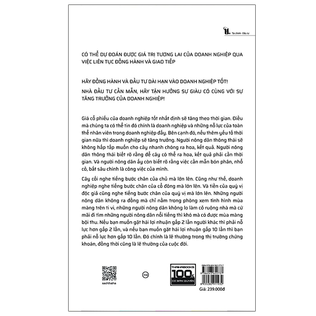 [ThaiHaBooks] Một trong những nhận thức sai lầm về việc đầu tư chứng khoán là đầu cơ và kiếm tiền trong thời gian ngắn. Tác giả đã ví việc đầu tư chứng khoán như công việc của một nhà nông và khuyên độc giả nên đầu tư với tấm lòng của một người nông dân chứ không phải một thợ săn. Giống như việc một nhà nông cần nhiều thời gian và nỗ lực để gieo hạt vào mùa xuân, chăm sóc và thu hoạch vào mùa thu, đầu tư chứng khoán cũng phải cần có tư duy như thế, nhà đầu tư cũng cần một quá trình gieo hạt vốn vào công ty có triển vọng, thăm doanh nghiệp, theo dõi các hoạt động của doanh nghiệp. Những nguyên tắc đầu tư được đúc kết trong một thời gian dài qua việc đầu tư dài hạn đã được tác giả giải thích một cách thân thiết và ấm áp: