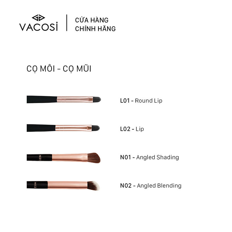 Cọ Khối Mũi Vacosi (Đầu Tròn) N02 Thành Phần Chính Và Công Dụng: - Ngoài chức năng tạo khối sóng mũi tự nhiên, với thiết kế đầu vát xéo cùng bó cọ tròn phối hợp