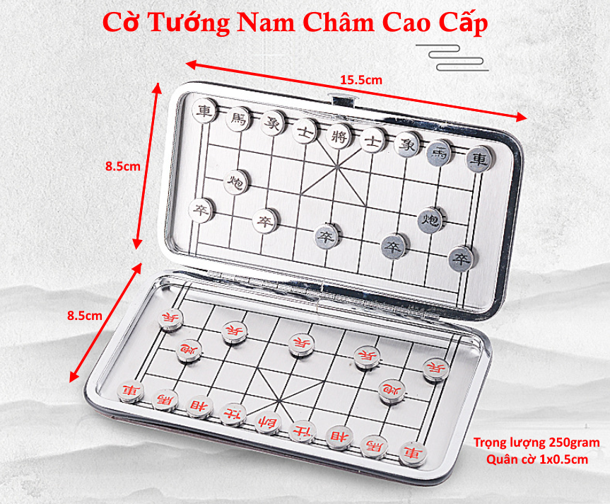 - Trọng lượng 250gram, đường kính quân cờ 1cm; Gấp gọn thành hộp kích thước: 17cm x 8cm