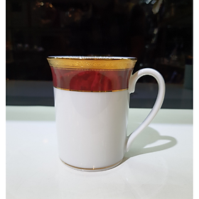 Cốc nổi bật với điểm nhấn mạ vàng hoa văn sang trọng quanh miệng cốc, bên dưới là lớp men màù đỏ tươi vân đá nổi bật bên cạnh lớp men trắng sứ sáng bóng, xen giưa 2 lớp men là đường chỉ vàng