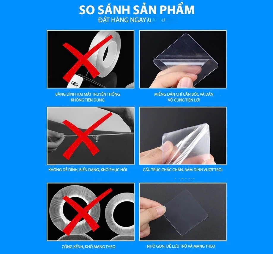 Điểm nổi bật: - Băng keo dán nano 2 mặt siêu dính là sản phẩm hoàn toàn mới lạ nhưng lại vô cùng hữu ích trong sinh hoạt hằng ngày với tính đa năng: Dán