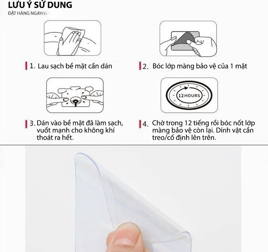 Mua tại TiktokMô tả sản phẩm Tấm keo trong 2 mặt đa năng được sử dụng nhiều trong đời sống hàng ngày. Đặc biệt có thể rửa sạch và sử dụng lại. Không để lại vết keo sau khi tháo ra khỏi bề mặt dán. Tính năng chống nước, chống lão hóa, có thể sử dụng trong nhiều năm. Có thể cắt nhỏ tùy ý phù hợp nhiều mục đích sử dụng. Cách sử dụng: lau sạch bề mặt, đảm bảo bề mặt không dính bụi, dán một mặt vào và đợi 12 tiếng để dính hẳn rồi mới dán lên bề mặt kia. Bề mặt không dùng được: Tường sơn, quét vôi, bề mặt có vân hoặc không bằng phẳng.