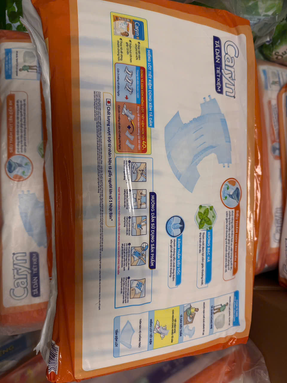 Mô Tả Sản Phẩm Tã Dán người lớn Caryn Gói Lớn Tã dán Siêu thấm Caryn cải tiến mới với “Đệm thấm xanh" chuyên biệt tại vùng xương cụt, với các hạt thấm hút tăng