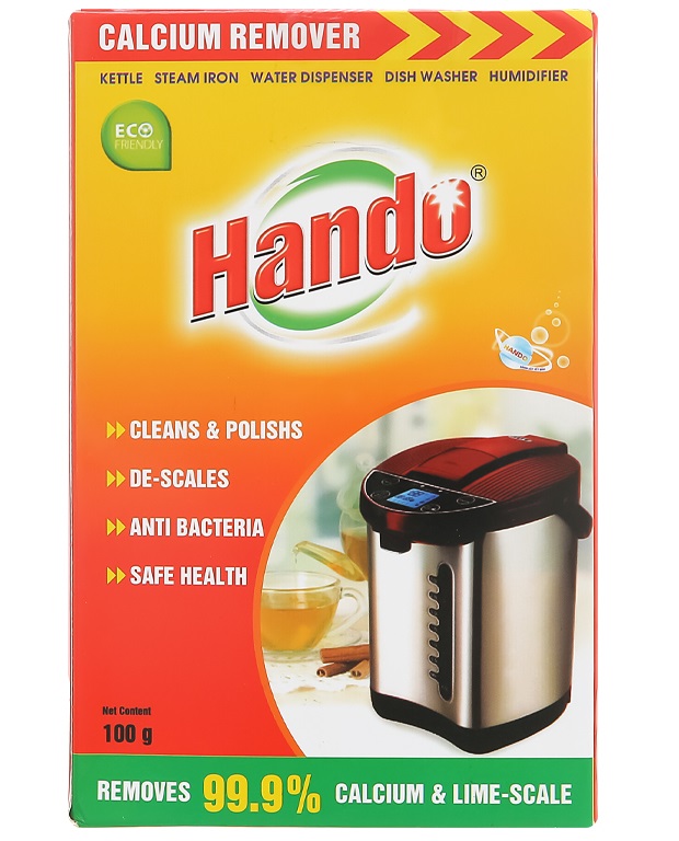 Thông tin sản phẩm Tên sản phẩm : Bột tẩy cặn nước đá vôi ấm đun, bình nước Hando Hướng dẫn sử dụng : Cho nước vào ấm và phích, đổ bột theo tỷ lệ