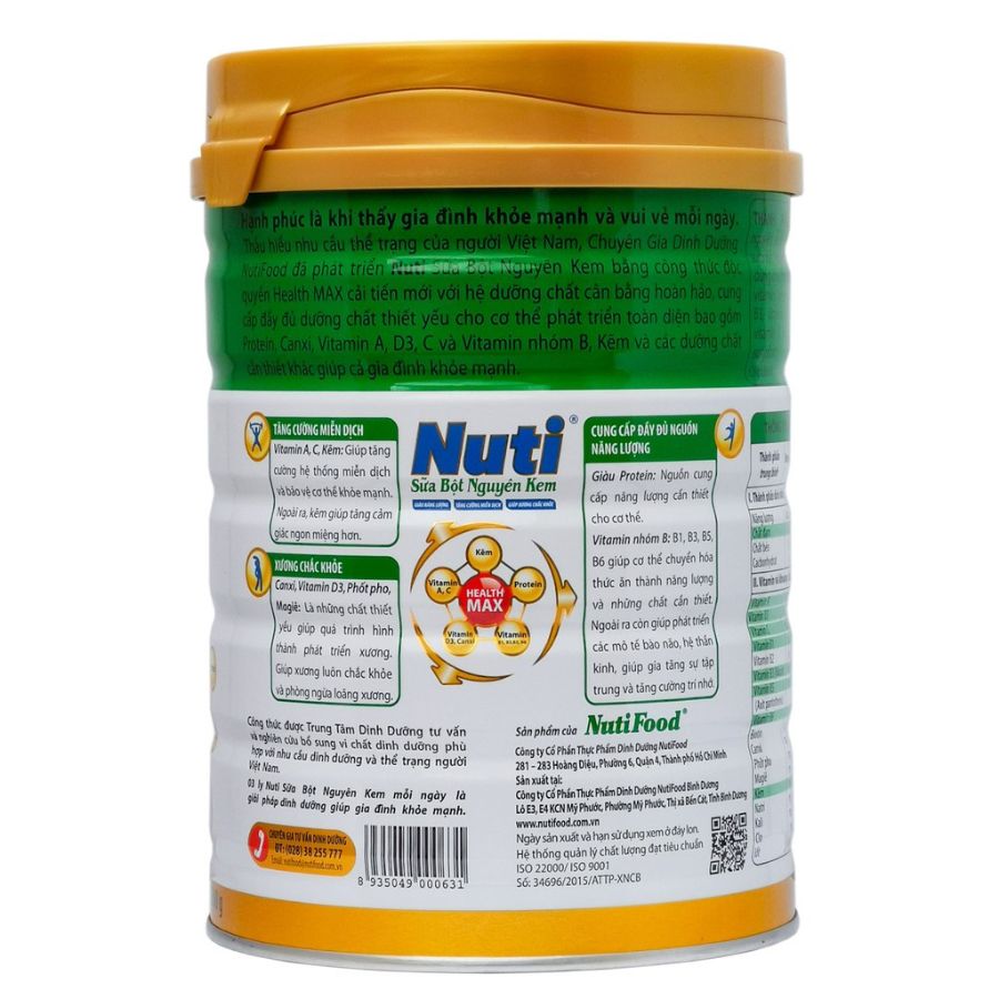 Thấu hiểu nhu cầu thể trạng của người Việt Nam, Chuyên Gia Dinh Dưỡng NutiFood đã phát triển Nuti Nguyên Kem bằng công thức độc quyền Health MAX cải tiến mới với hệ dưỡng chất cân bằng hoàn hảo cung cấp đầy đủ dưỡng chất thiết yếu cho cơ thể phát triển toàn diện bao gồm Protein, Canxi, Vitamin A, Vitamin D, Vitamin nhóm B, Kẽm và các dưỡng chất cần thiết khác giúp cả gia đình khỏe mạnh.