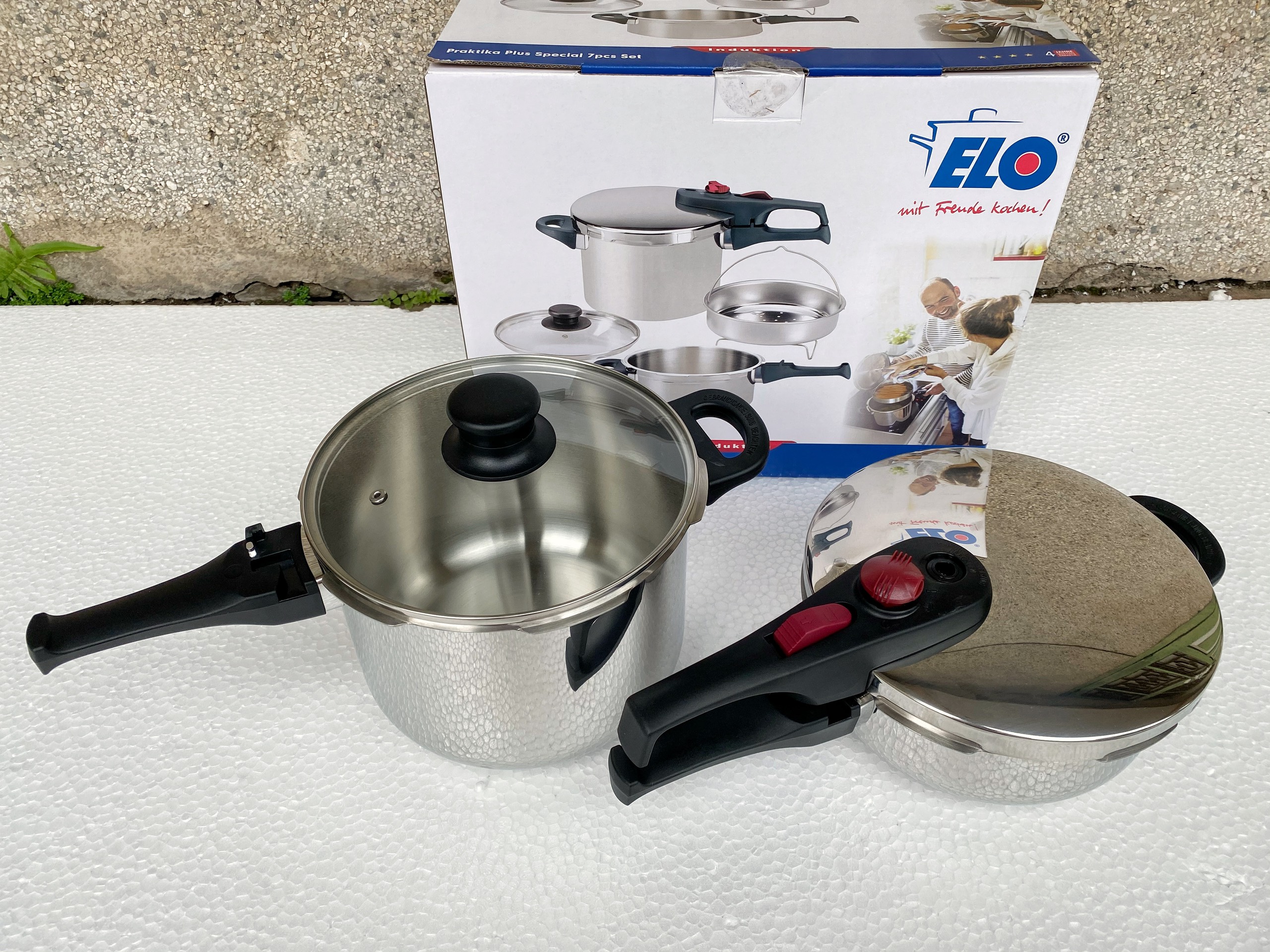 Mua tại TiktokThông số kỹ thuật Tên sản phẩm: Bộ nồi áp suất Elo Praktika Plus XL 6 Lít Chất liệu: Thép không gỉ 304 (18/10). Dung tích: 6L./ 3 lít Loại bếp: Sử dụng trên mọi loại bếp Kích thước: 22 cm (6 lít) và 18 cm cho nồi 3 lít Độ dày thân nồi: 1.2mm. Độ dày đáy nồi: 4.0mm. Thương hiệu: Đức Sản xuất : Đức