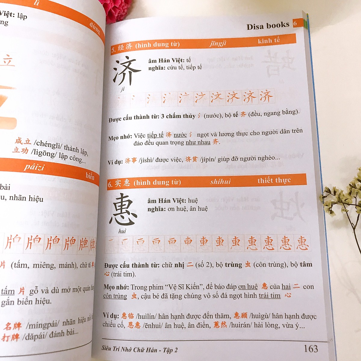 - Siêu trí nhớ chữ Hán tập 01 (In màu, có Audio nghe) Nội dung sách: Giúp bạn dễ dàng nhớ ngay 1000 chữ Hán chỉ sau 2 tháng thông qua mẹo nhớ và hình ảnh dễ hiểu. Tác giả: Diệu Hồ – Phạm Thành Luân Số trang: 250 Năm xuất bản: 2019 Nhà Xuất Bản: Đà Nẵng Cách nhớ chữ Trung Quốc (chữ Hán) a. Nhớ chữ Hán bằng các bộ thủ Bộ thủ chính là cách nhớ chữ Hán hiệu quả , mỗi bộ thủ trong tiếng Hán lại biểu hiện một hiện tượng sự vật riêng. Nhớ được các bộ thủ đó chính là đã nhớ cách viết tiếng Trung như thế nào. Và việc còn lại chính là ghép các bộ thủ đó với nhau để tạo nên được một chữ hoàn chỉnh. vd: chữ 安 Ở trên là bộ 宀 miên => mái nhà mái che, Ở dưới là bộ女 nữ => nữ giới, con gái, đàn bà. Người phụ nữ ở dưới trong nhà thì rất “an” toàn. Ví dụ: 安全 (Ānquán) – An Toàn. Mẹo nhỏ cho những người mới học viết tiếng Trung có thể nhớ đó là dùng các mảnh giấy nhớ, ghi lại những bộ thủ hay những từ mới bằng việc tập viết tiếng Trung. Để những mảnh giấy nhớ đó ở những nơi dễ thấy. Việc nhìn liên tục đó sẽ giúp bạn vừa có thể nhớ chữ vừa có thể nhớ từ. b. Cách nhớ chữ Hán qua thơ Các từ chữ Hán được học bằng cách gieo vần nhịp để người học nhớ chữ Hán dễ hơn như: “Chim chích mà đậu cành tre Thập trên tứ dưới đè chữ tâm” (Chữ Đức) Hay: “Tai nghe miệng nói đít làm vua”. (Chữ Thánh) Nhớ chữ Hán bằng cách vẽ lại những từ đấy. Nhớ các nét, mô phỏng lại và vẽ, đây là một trong những cách rất tốt để nhớ chữ Hán Chữ Hán có hai cách viết là giản thể và phồn thể. Đa phần các giáo trình tiếng Trung đều là chữ giản thể do đó rất nhiều trường hợp đã gặp lúng túng khi tiếp xúc với chữ phồn thể. Nếu để ý thì cách chữ phồn thể có cách viết chỉ khác chữ giản thể một chút. Trong quá trình học, đừng ngần ngại mà nhờ giáo viên chỉ hướng dẫn cách viết chữ phồn thể (viết tiếng trung) nếu công việc của bạn phải tiếp xúc với kiểu chữ này.