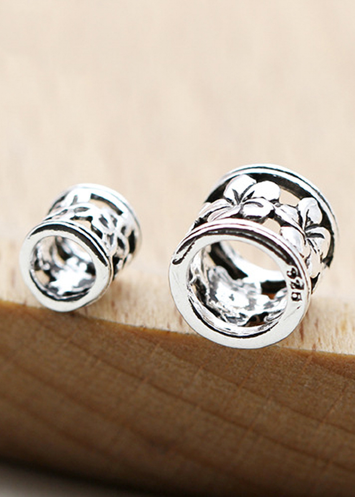 CHARM BẠC CHẶN HẠT HÌNH TRỤ HỌA TIẾT BÔNG HOA