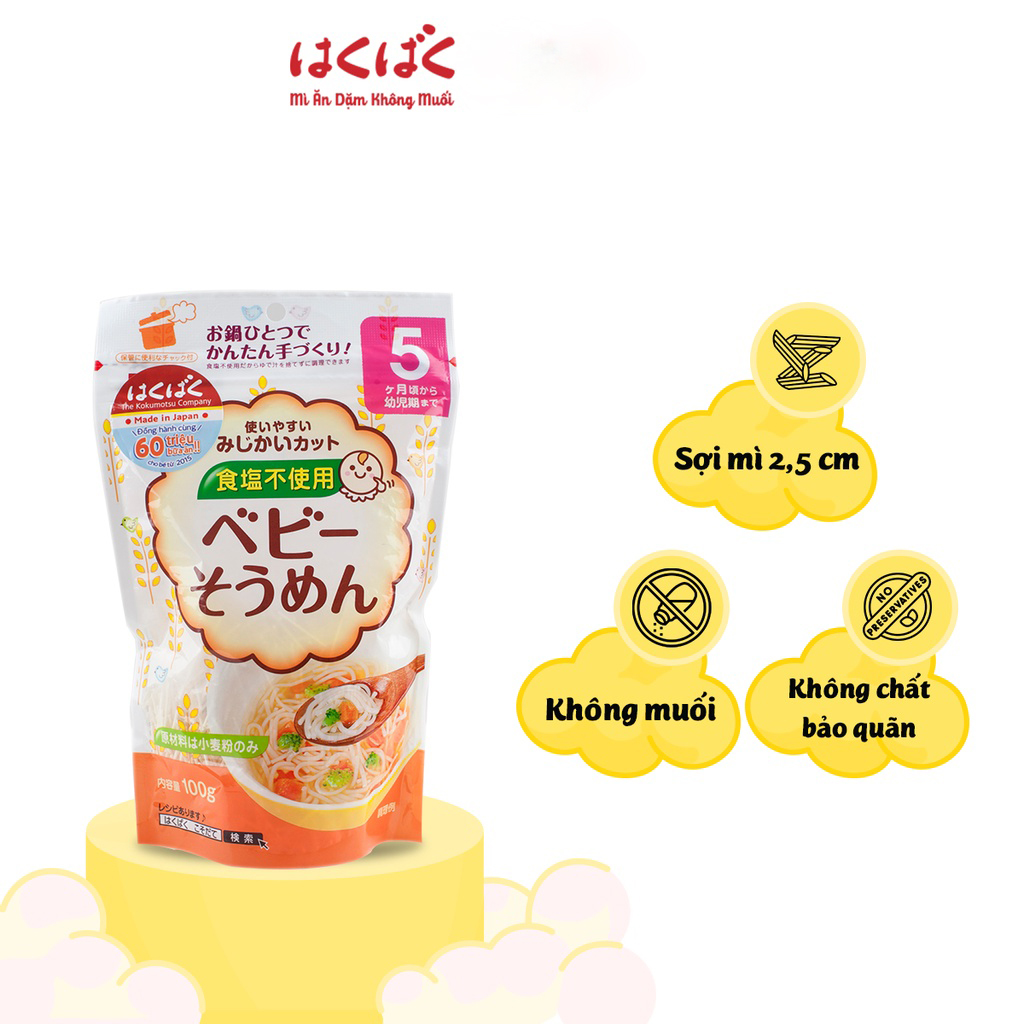 Thương hiệu: Haku baku Xuất xứ: Nhật Bản Ngày sản xuất: 18 tháng trước hạn sử dụng. Khối lượng tịnh: 100g Mỳ Ăn Dặm Hakubaku (Dành Cho Bé Từ 6 Tháng ) có độ trơn