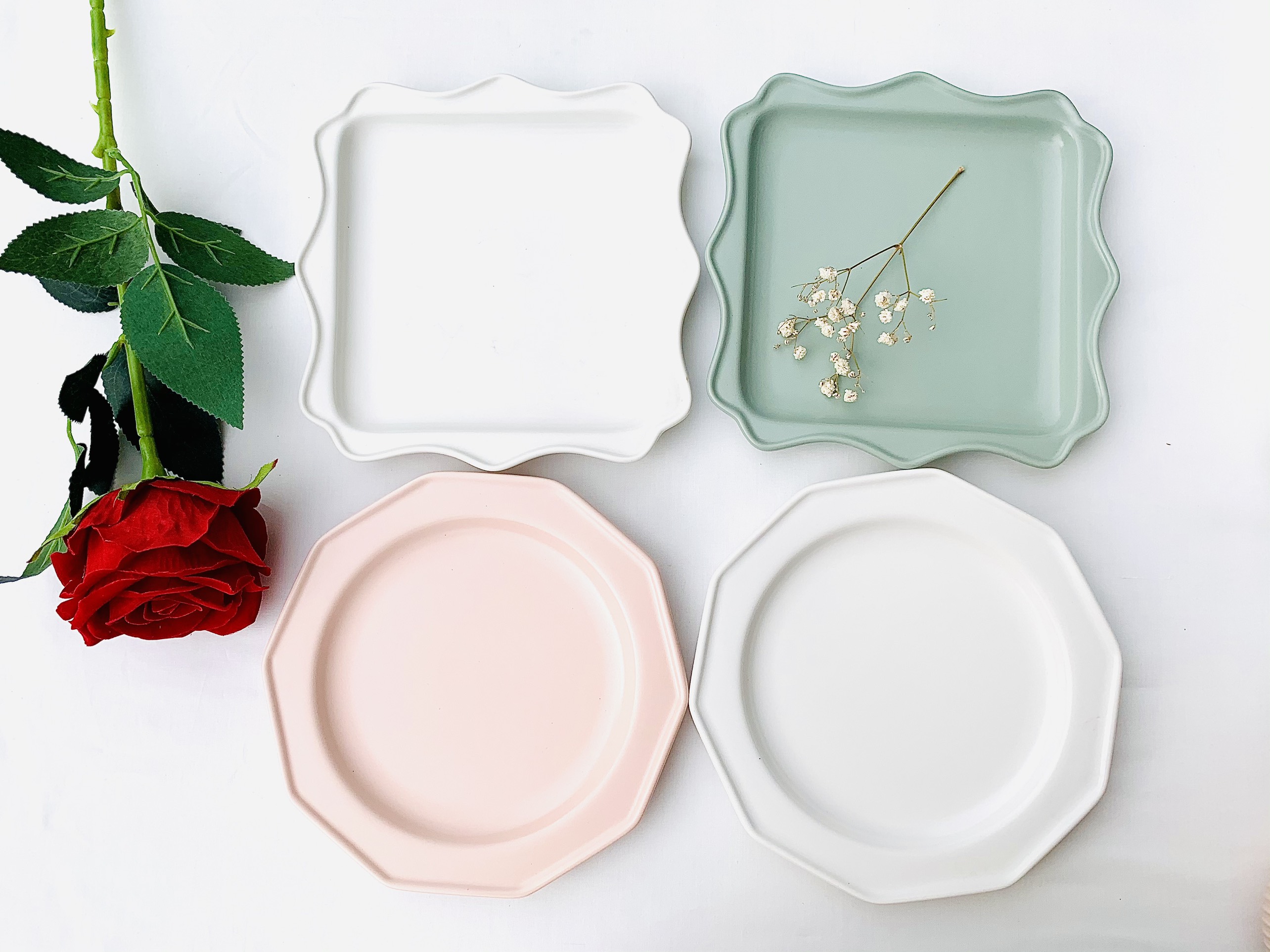 Combo 4 đĩa Bella 8" Bao gồm: Đĩa tròn 8": Trắng, hồng Đĩa vuông 8": Trắng, bạc hà