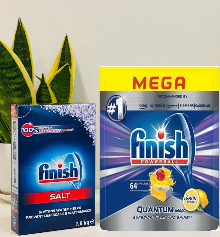 Để ngăn ngừa canxi máy rửa chén được trang bị với 1 chất làm mền nước. Muối rửa bát finish là loại muối đặc biệt không phải muối ăn ( muối bình thường có thể chứa các thành phần không hòa tan, mà còn là dư lượng trên các món ăn và dẫn đến làm hại máy rửa bát, muối rửa bát finish nhập khẩu giúp bảo vệ cả máy rửa chén, bộ lọc và phun cũng như đồ sành sứ và dao kéo.