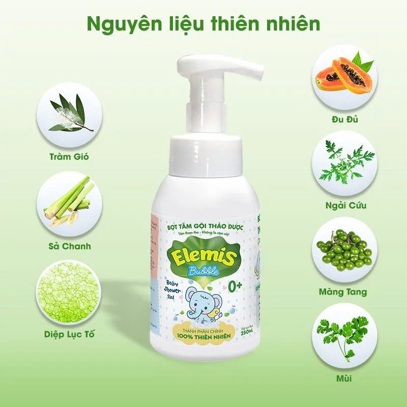 Bọt tắm gội thảo dược Elemis Bubble với các chiết thảo dược thiên nhiên từ Đu đủ, Ngải cứu, tinh dầu Màng tang, tinh dầu Mùi, tinh dầu Tràm gió, tinh dầu Sả chanh. Bọt tắm gội thảo dược Elemis Bubble có tác dụng làm sạch, dưỡng ẩm và bảo vệ bé trước các vấn đề về da thường gặp như rôm sảy, hăm tả, mẩn ngứa, mụn nhọt… Thành phần Thành phần thiên nhiên: Chiết xuất Papain từ Đu đủ Chiết xuất Ngải cứu (Artemisia princeps extract) Chiết xuất tinh dầu Màng tang (Litsea cubeba oil) Chiết xuất tinh dầu Mùi (Coriandrum sativum oil) Chiết xuất tinh dầu Tràm gió (Melaleuca cajuputi oil) Chiết xuất tinh dầu Sả chanh (Cymbopogon flexuousus oil) Chiết xuất Diệp lục tố (Chlorophyll) Thành phần đầy đủ: Berberin nano, Aquaxyl, Glycerin, Tween 80, Natri benzoat, Betain, Triethanolamin, HPMC E6 (Hydroxypropyl methylcellulose), SLES (Sodium lauret ether sulfat), Transcutol, PEG 4000, Acid citric, Nước tinh thiết. Công dụng Làm sạch và bảo vệ da, giúp da bé khỏe mạnh. Hỗ trợ kháng khuẩn, phòng chống rôm sẩy, làm dịu vết hăm nẻ, hăm tả, giảm mụn nhọt. Dưỡng ẩm tự nhiên, chống khô da, giúp da bé luôn mềm mại, thơm mát. Hướng dẫn sử dụng Bước 1: Làm ướt tóc và cơ thể bé bằng nước ấm. Bước 2: Nhấn 2-3 lần bọt mịn ra tay, rồi xoa nhẹ nhàng toàn cơ thể bé để làm sạch. Bước 3: Tắm gội lại với nước ấm. Sử dụng hàng ngày cho bé để đạt được kết quả tốt nhất. Đối tượng sử dụng Trẻ sơ sinh và trẻ nhỏ.