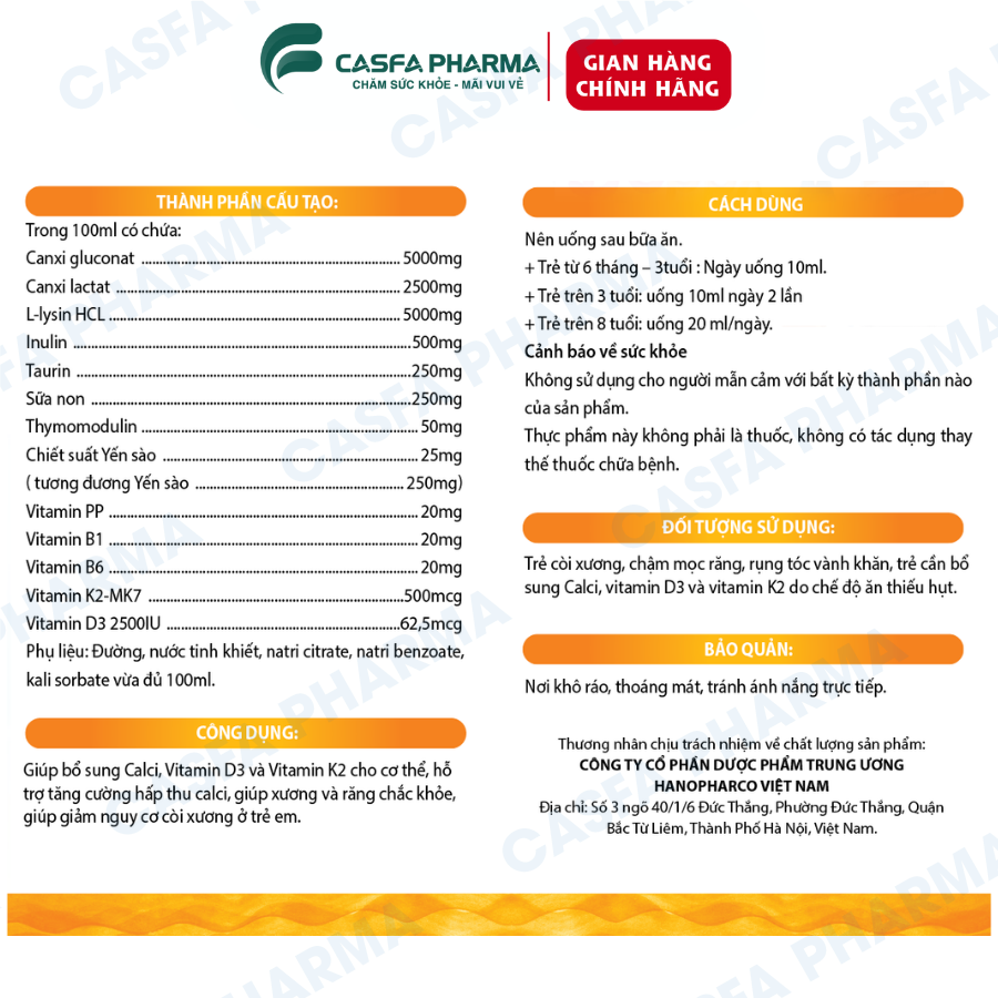 Dành cho sức khỏe xương và răng của bé, giúp tăng chiều cao và phát triển cơ thể mạnh mẽ. Hộp 20 gói * 10ml.