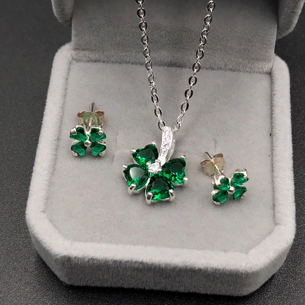 Combo Dây Chuyền Hoa Tai Bạc Ta Cỏ 4 Lá Màu Xanh May Mắn BẠC HIỂU MINH BCB006