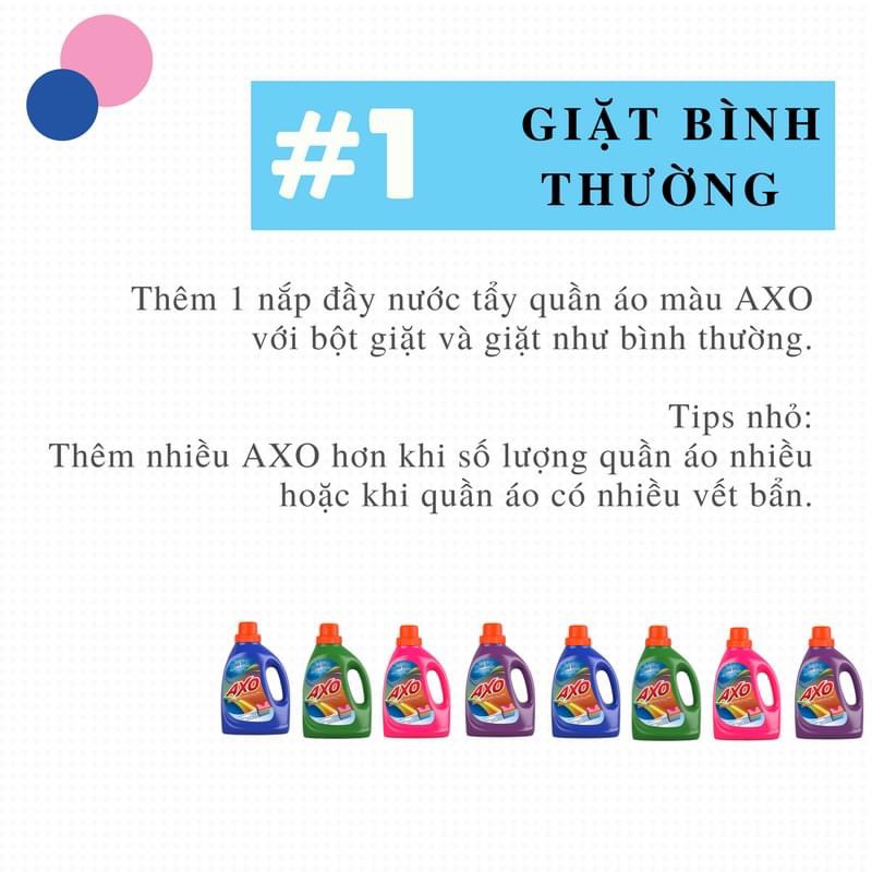 - Giặt bình thường: Thêm 1 nắp đầy nước tẩy bảo vệ màu AXO với bột giặt và giặt như bình thường. Thêm nhiều nước tẩy khi số lượng quấn áo nhiều và có nhiều vết bẩn.