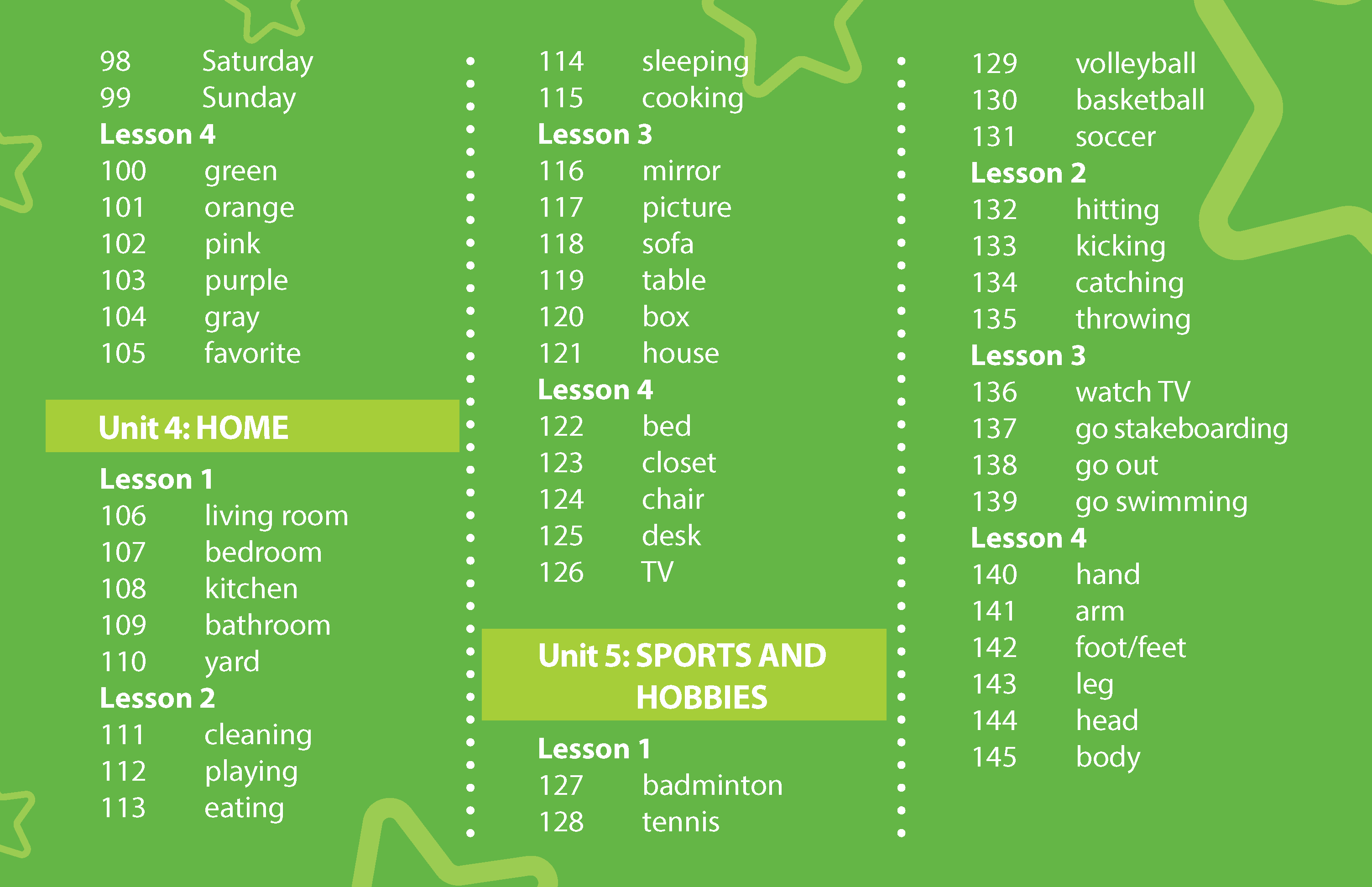 Sách: Learning English 4 - Dành Cho Học Sinh Lớp 4 NỘI DUNG VÀ CẤU TRÚC CỦA QUYỂN SÁCH : Bảng mục lục: Chỉ rõ các mục tiêu chính và trọng tâm của mỗi bài