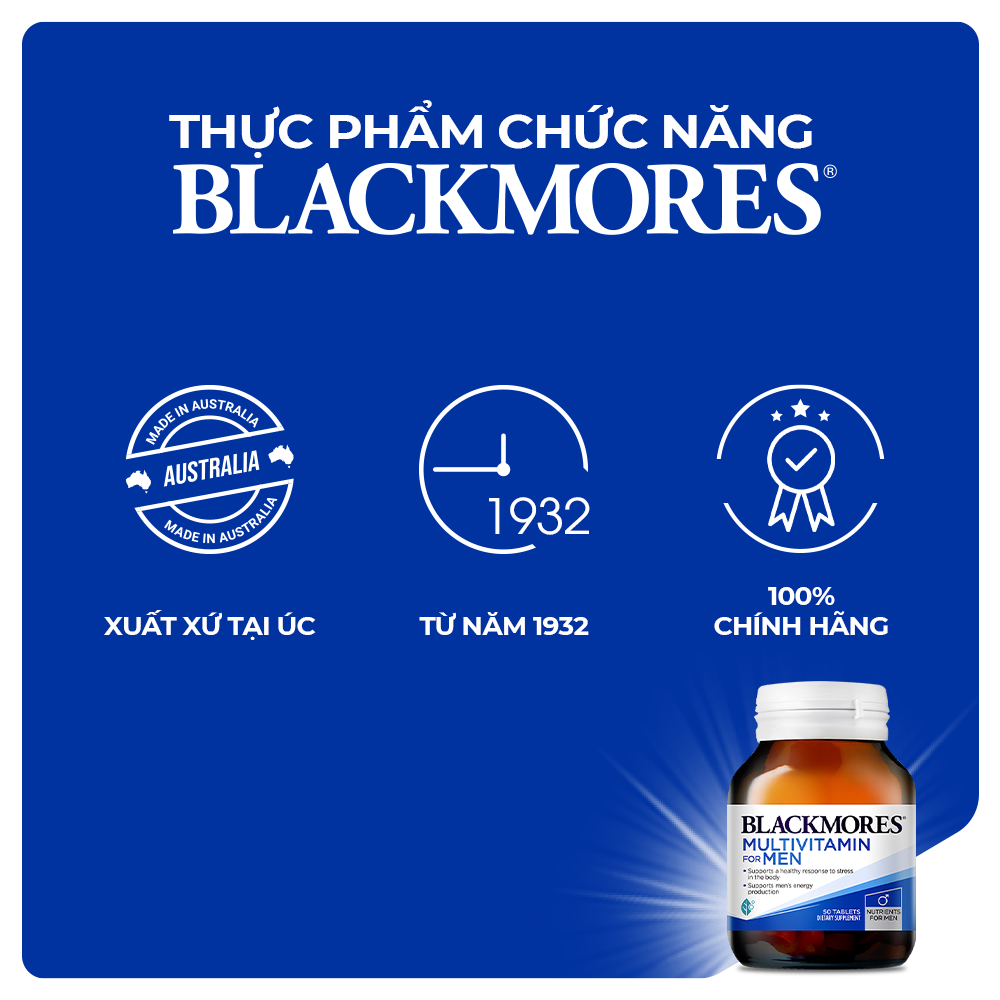 Blackmores là công ty dẫn đầu trong lĩnh vực chăm sóc sức khoẻ từ thiên nhiên của Úc được thành lập vào năm 1930. Dựa trên tầm nhìn và niềm đam mê của ông Maurice Blackmore – người sáng lập thương hiệu – Blackmores luôn nỗ lực tạo ra những sản phẩm bảo vệ sức khỏe từ các loại thảo mộc tự nhiên. Không chỉ gây ấn tượng về bề dày lịch sử và sự phát triển ổn định của công ty, Blackmores còn nỗ lực tạo ra nhiều hơn giá trị cộng đồng như bảo vệ môi trường, hỗ trợ cho cộng đồng, thúc đẩy tư duy đầu tư để có một cơ thể khỏe mạnh. Đến nay, Blackmores vẫn không ngừng nghiên cứu, tìm tòi để phát triển các sản phẩm mới nhằm mang đến sự chăm sóc tốt hơn cho sức khỏe khách hàng.