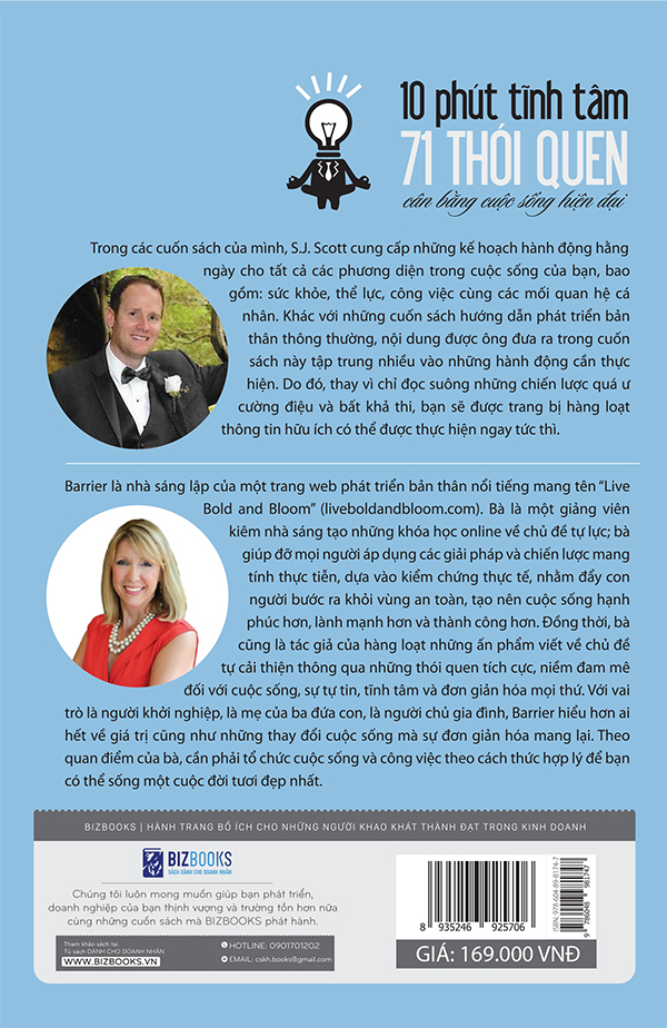– Đề ra 71 thói quen tĩnh tâm từ sáng đến chiều, tối mà bạn nên thực hành. Đây là những thói quen toàn diện về cả thể chất, tinh thần như thói quen dậy sớm, hít thở buổi sáng, sắp xếp giường chiếu, mỉm cưởi ra sao, suy nghĩ tích cực như thế nào, thậm chí cả việc rửa bát.