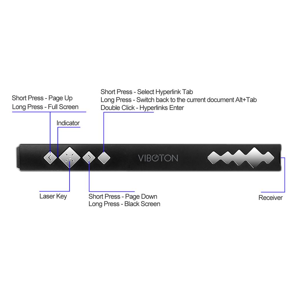 It supports page up and down, full screen, black screen, hyperlinks select enter, Alt+Tab and red laser. Jusr press the relevant function button to control your ducuments.