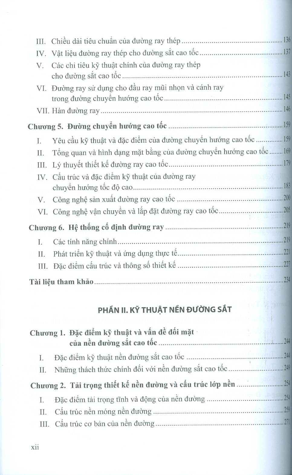Cuốn sách Công nghệ xây dựng đường sắt cao tốc Trung Quốc có 6 phần, bản dịch được chia làm 2 tập: - Tập I: Bao gồm 2 phần, trong đó: Phần 1 là Công nghệ đường ray giới thiệu về kết cấu tầng trên, đường ray không khe nối, các thành phần kết cấu và hệ thống liên kết chúng. Kỹ thuật thiết kế đường ray không ballast dạng tấm bản kết hợp công nghệ đường ray không khe nối siêu dài vượt khu gian với bộ ghi không khe nối có tốc độ cao vi cho hướng rẽ đáp ứng vận hành an toàn êm thuận của đường sắt tốc độ cao hiện đại; Phần 2 là Kỹ thuật nền đường sắt với nội dung tập trung vào những kiến thức cơ bản và kỹ thuật liên quan đến nền đường sắt cao tốc, bao gồm: đặc điểm và thách thức kỹ thuật, tải trọng thiết kế và cấu trúc lớp đệm, vật liệu và chất lượng nén chặt, công nghệ kiểm soát lún, giám sát và đánh giá trạng thái nền đường. - Tập II: Bao gồm 4 phần, trong đó: Phần 3 là Công trình cầu đường sắt cao tốc với các nội dung như tổng quan về công nghệ cầu đường sắt cao tốc, tiêu chuẩn kỹ thuật cầu đường sắt cao tốc, hệ thống kết cấu chính của cầu đường sắt cao tốc, bảo dưỡng và sửa chữa cầu trên đường sắt cao tốc; Phần 4 là Kỹ thuật thi công đường hầm tập trung vào các vấn đề như khí động học, cấu trúc giảm chấn và kỹ thuật bảo trì đường hầm đường sắt cao tốc; Phần 5 là Công trình nhà ga nhấn mạnh vào yếu tố nhân văn, thẩm mỹ và thực tiễn, tập trung vào quy hoạch, thiết kế và xây dựng, các công nghệ tiên tiến và phương pháp thi công mới cho các hạng mục như nền móng, kết cấu chính của nhà ga, mái che có nhịp lớn và không gian lớn, đồng thời đưa ra các giải pháp thi công thân thiện với môi trường; Phần 6 Giới thiệu thực tiễn kỹ thuật tuyến Bắc Kinh - Thiên Tân, nội dung bao gồm các công nghệ xây dựng cơ sở hạ tầng trước ga cho đường sắt cao tốc như nền đường, cầu cạn, đường ray không ballast và các biện pháp bảo vệ môi trường, đồng thời đề xuất giải pháp xử lý kỹ thuật đối với việc lắp đặt đường ray không ballast tại những khu vực có hiện tượng lún đất.