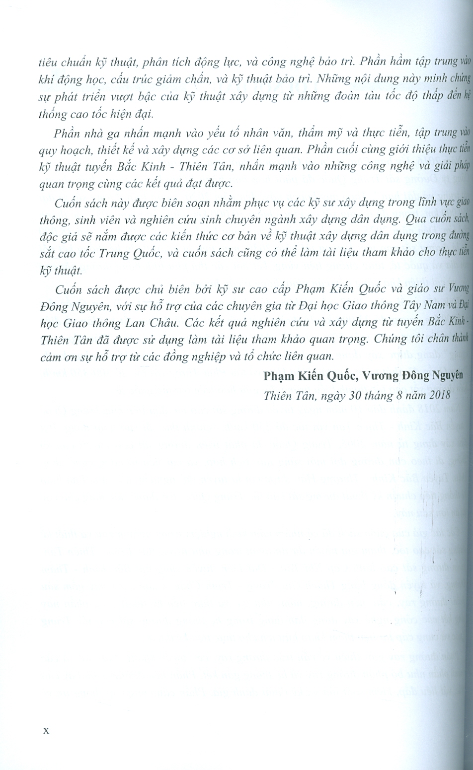 Cuốn sách này được biên soạn nhằm phục vụ các kỹ sư xây dựng trong lĩnh vực giao thông, sinh viên và nghiên cứu sinh chuyên ngành xây dựng dân dụng. Qua cuốn sách, đọc giả sẽ nắm được các kiến thức cơ bản về kỹ thuật xây dựng dân dụng trong đường sắt cao tốc Trung Quốc, và cuốn sách cũng có thể làm tài liệu tham khảo cho thực tiễn kỹ thuật tại Việt Nam trong quá trình xây dựng tuyến Đường sắt cao tốc Bắc - Nam thời gian tới.