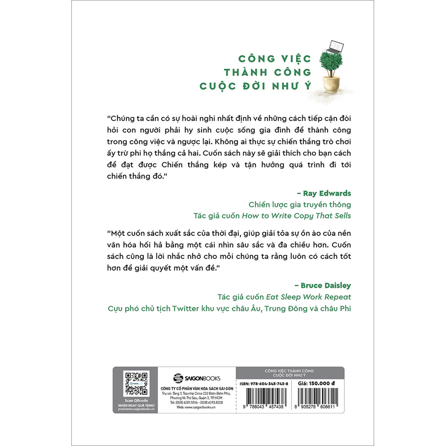 CÔNG VIỆC THÀNH CÔNG - CUỘC ĐỜI NHƯ Ý 5 nguyên tắc giải phóng bản thân khỏi thói nghiện công việc Làm gì để thành công trong công việc lẫn đời sống cá nhân? Nếu bạn tin rằng bạn có thể dành nhiều giờ để thăng tiến trong sự nghiệp hoặc gác lại tham vọng để tận hưởng một cuộc sống cá nhân trọn vẹn, thì bạn đang đối mặt với một sự lựa chọn bất khả thi. Trong sách “Công việc thành công - Cuộc đời như ý” (Win at Work và Succeed at Life, tác giả bán chạy nhất của New York Times - Michael Hyatt và Giám đốc điều hành - Megan Hyatt Miller) đã vạch trần những người nổi tiếng ủng hộ “làm việc quá sức" và chỉ cho bạn cách đạt được thành công trong công việc mà không phải hy sinh cuộc sống cá nhân của mình - một khái niệm được gọi là “Chiến thắng kép”. Đây là ý tưởng cho rằng bạn không cần phải hy sinh sự nghiệp của mình cho các mối quan hệ, sức khỏe hoặc lợi ích cá nhân. Bạn cũng không cần phải thỏa hiệp cuộc sống cá nhân của mình để đạt được thành công trong nghề nghiệp. Bạn có thể có cả hai. Và tác giả Michael và Megan nêu chi tiết các bước chính xác để giúp bạn biến điều đó thành hiện thực. Vì sao không nên tin vào những lối thúc đẩy làm việc để “giành chiến thắng”? Các nhà lãnh đạo vĩ đại thường thúc đẩy chúng ta giành chiến thắng trong sự nghiệp. Tuy nhiên, những thành công trong sự nghiệp có thể phải trả giá đắt bằng sức khỏe, các mối quan hệ và hạnh phúc cá nhân của bạn. Tại sao có vẻ như không thể vừa thắng trong công việc vừa thành công trong cuộc sống? Câu trả lời sẽ nằm trong quyển sách “Công việc thành công - Cuộc đời như ý” này. Trong sách, tác giả Michael Hyatt và Megan Hyatt Miller chia sẻ rằng họ biết chúng ta có thể làm tốt hơn để thành công trong sự nghiệp và đời sống cá nhân vì anh ấy đã nhìn thấy điều đó trong hơn bốn thập kỷ của mình với tư cách là một nhà điều hành thành công và một người chồng, người cha. Hơn hết, Michael và con gái của ông, Megan Hyatt Miller - chủ tịch và giám đốc điều hành của Full Focus đã giành được “chiến thắng kép”. Ngoài ra, cuốn sách này cũng được hỗ trợ bởi nghiên cứu học thuật từ khoa học tổ chức và tâm lý học, đồng thời được minh họa bằng các nghiên cứu điển hình mở rộng từ các lĩnh vực kinh doanh khác nhau. “Công việc thành công - Cuộc đời như ý” là tuyên ngôn về cách bạn có thể đạt được cân bằng giữa công việc và cuộc sống và khôi phục sự tỉnh táo của bạn. “Công việc thành công - Cuộc đời như ý” – Công cụ giúp bạn giải phóng bản thân khỏi thói nghiện công việc Với lối viết rõ ràng minh bạch pha chút hài hước và đầy động lực, các tác giả chỉ ra rằng làm việc điên cuồng trong nhiều giờ khiến bạn không còn thời gian cho gia đình, bạn bè và những sở thích khác là thiển cận và không bền vững. Điều tốt nhất là nên có sự cân bằng tuyệt vời giữa công việc và cuộc sống. Cách tiếp cận năm nguyên tắc của họ để đạt được điều đó là thiết thực và quan trọng nhất là bền vững. Tất cả công nghệ truyền thông mà chúng ta coi là đương nhiên ngày nay thực sự có tác dụng phụ làm chúng ta cảm thấy như chúng ta cần phải “online” 24/7 - một điều hoàn toàn không tốt. Thông điệp cơ bản từ cuốn sách này là bạn nên dành thời gian nghỉ ngơi chất lượng, bạn sẽ đạt được nhiều thứ hơn trong thời gian ngắn hơn với công việc của mình. Ngủ đủ giấc, có sở thích, mối quan tâm và các mối quan hệ là một điều cần thiết. Chúng là những ‘tính năng’ góp phần làm cho chúng ta làm việc hiệu quả hơn. Tóm lại, sự cân bằng tuyệt vời giữa công việc và cuộc sống là một điều hoàn toàn có thể nếu chúng ta học được những giải pháp cân bằng.