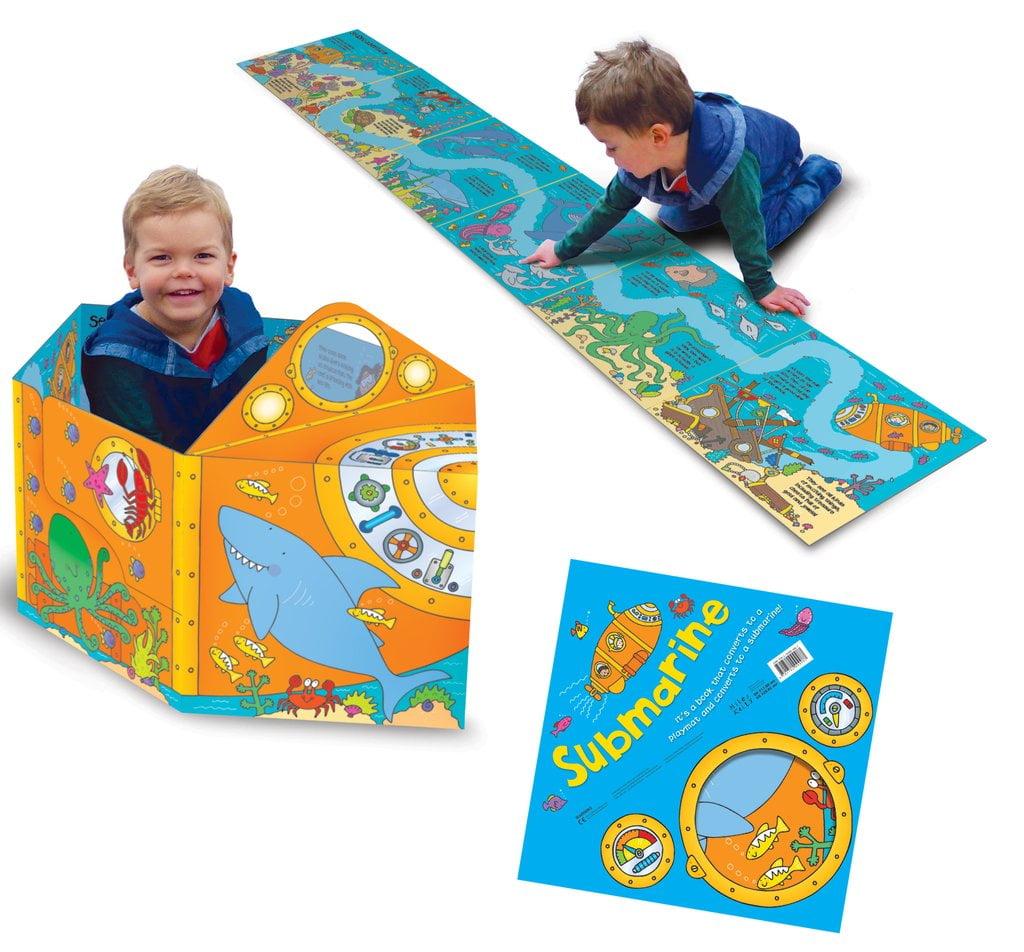 Convertible Submarine Convertible Submarine is a fun storybook for ages 3+ that can also be used as a playmat and a sit-in vehicle for toddlers. Once unfolded, parent and child can read the text, which describes an exciting journey to a shipwreck in a submarine. The bright, busy illustrations are packed with colourful details such as tropical fish and lost treasure. Laid on the floor, the book can also be used as a playmat. The boards can then be refolded into a large, sturdy submarine that a child can sit in and pretend to drive. Convertible Submarine is the perfect playbook for toddlers aged 3+ years to read, play and pretend to drive a submarine into the deep ocean! Fun, underwater adventure story for your child to enjoy Folds into a submarine for your child to play inside Wonderful illustrations by Simon Abbott, packed full of charming details