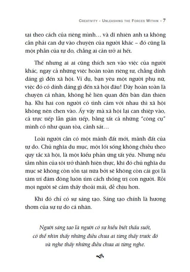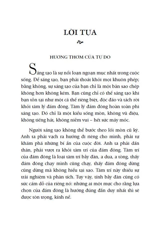 Người sáng tạo không thể bước theo lối mòn cũ kỹ. Anh ta phải vạch ra hướng đi riêng cho m.ình, phải tự khám phá những bí ẩn của cuộc đời. Anh ta phải dấn thân, phải vượt ra khỏi tâm trí của đám đông. Tâm lý đám đông cũng có sức cám dỗ của riêng nó: những ai một mực cho rằng lựa chọn của đám đông là hướng đúng đắn duy nhất thì sẽ được tôn trọng, kính nể.
