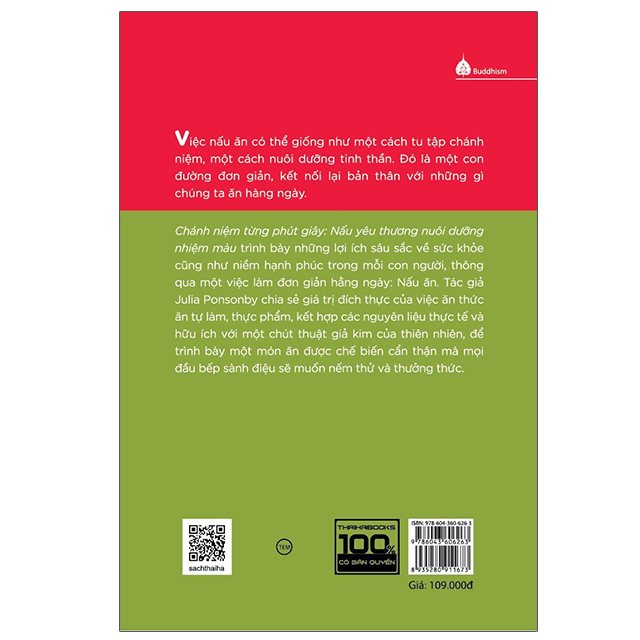 Cuốn sách nhẹ nhàng này sẽ giúp bạn hạnh phúc hơn ngay cả khi bạn đang nấu nướng. Khi thay đổi góc nhìn, tâm thế của chúng ta cũng sẽ thay đổi theo. Đây là cuốn sách nằm trong bộ “Chánh niệm từng phút giây”. Cuốn sách gợi mở những suy nghĩ mới về nấu ăn – một trong những hoạt động thú vị nhất mà chúng ta thực hiện mỗi ngày – như một cách tiếp cận có “chánh niệm” hơn với cuộc sống.