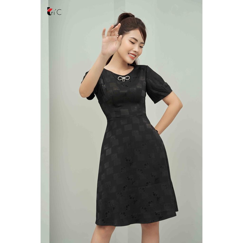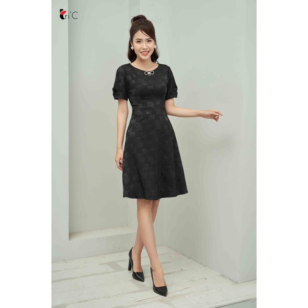 ✨Đầm tafta lụa hoa ô, tay bồng, cài nơ đá Tri'C Luxury A23321 Đen