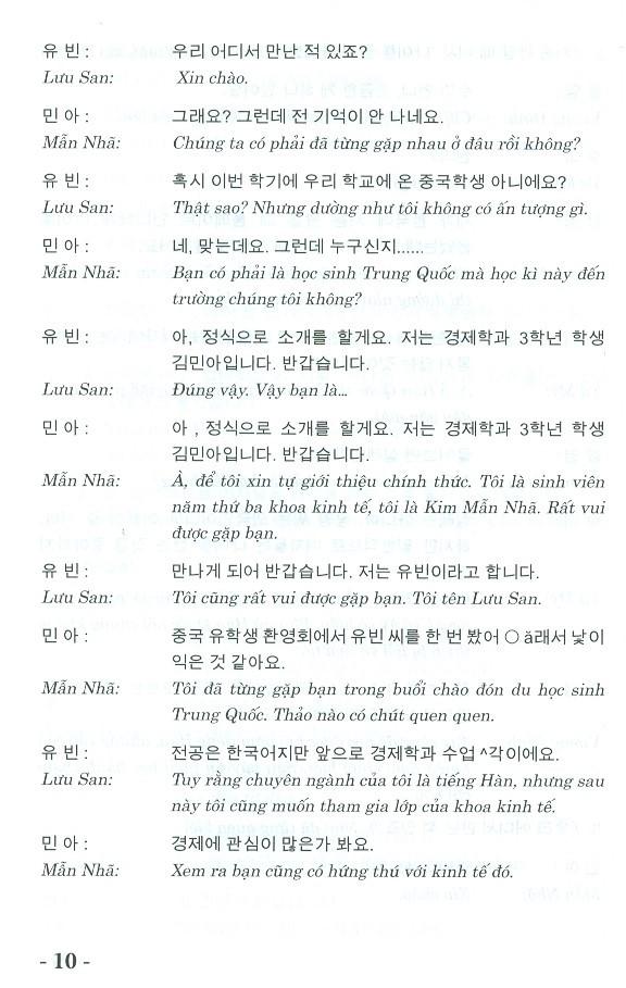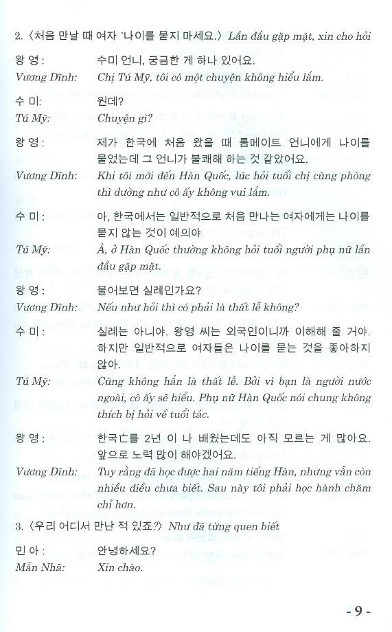 Sách gồm 5 phần, trình bày nhiều mẫu đàm thoại tiếng Hàn theo từng tình huống giao tiếp trong thực tế. Từ việc chào hỏi và giới thiệu vào lần đầu gặp mặt, cách nói lời cảm ơn hay xin lỗi, cách giao tiếp trong cuộc sống hằng ngày, cho đến các tình huống giao tiếp trong các hoạt động vui chơi giải trí, trong du lịch và giáo dục.