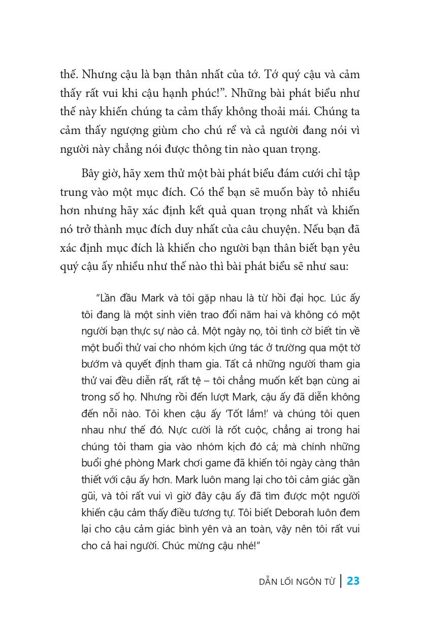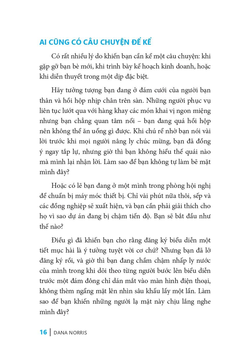 Dẫn Lối Ngôn Từ Ai cũng có câu chuyện để kể Có rất nhiều lý do khiến bạn cần kể một câu chuyện: khi gặp gỡ bạn bè mới, khi trình bày kế hoạch kinh doanh, hoặc khi diễn thuyết trong một dịp đặc biệt. Nghệ thuật kể chuyện không chỉ để khuấy động không khí cho đám đông mà còn là công cụ hữu ích cho cuộc sống. Ví dụ khi bạn đang tham dự một cuộc họp kinh doanh, một câu chuyện sẽ giúp bạn nhấn mạnh quan điểm của mình hơn rất nhiều; một câu chuyện cũng rất cần thiết để kêu gọi tình nguyện viên cho một tổ chức. Cho dù bạn đang kể chuyện cho bạn bè, sếp, khách hàng hay thậm chí một người xa lạ, quyển sách “Dẫn lối ngôn từ” cũng sẽ giúp ích cho bạn. Bạn sẽ nhận ra rằng: Đúng, bạn có thể kể chuyện. 10 quy tắc kể chuyện để thuyết phục Trong quyển sách “Dẫn lối ngôn từ”, tác giả tiết lộ tất cả những gì đã học được về nghệ thuật kể chuyện thông qua 10 quy tắc quan trọng. Quy tắc 1: Xác định mục đích: cung cấp cho bạn bối cảnh và đối tượng khán giả. Nhiệm vụ của bạn là liệt kê ra một vài mục đích thuyết phục cho mỗi tình huống. Quy tắc 2: Sử dụng cốt truyện: Hiểu được cốt truyện làchìa khóa để bạn biến trải nghiệm cá nhân thành một câuchuyện khiến người khác không thể không lắng nghe. Chương này đào sâu hơn và xem bạn có thể kết hợp mục đích với chủ đề để tạo thành một câu chuyện hấp dẫn như thế nào. Quy tắc 3: Thu thập chất liệu tốt nhất: Bạn đã học được cách xác định mục đích và sử dụng cốt truyện để định hình những gì mình sẽ kể. Phần này chuyển sang phần thú vị – tạo ra câu chuyện thực sự. Quy tắc 4: Xác định trọng tâm: phần này giúp bạn định hình lại mọi thứ, cắt gọt câu chuyện đến phần quan trọng nhất để duy trì được sự chú ý của người nghe. Quy tắc 5: Bất ngờ ở phút cuối: Cho dù mục đích của bạn khi kể chuyện là gì – để giải trí, cung cấp thông tin hay thuyết phục khán giả – thì phần kết cũng phải đảm bảo rằng bạn sẽ đạt được mục đích đó. Quy tắc 6: Ai cũng có thể kể chuyện: Một màn trình diễn tuyệt vời sẽ không thể khỏa lấp cho một câu chuyện dở tệ. Nhưng một câu chuyện tuyệt vời,dù được kể bởi một người không chuyên, vẫn có thể thu hút khán giả. Quy tắc 7: Dễ tổn thương là sức mạnh: Khi tạo dựng câu chuyện của riêng mình, việc chia sẻ mặt mềm yếu của bản thân là một cách hiệu quả để tạo ra tác động cảm xúc cho câu chuyện. Quy tắc 8: Tôn trọng khán giả: Giúp bạn xác định xem ai sẽ là khán giả để điều chỉnh câu chuyện cho phù hợp với họ. Phần lớn công đoạn này sẽ được thực hiện từ sớm, và phần còn lại có thể được xác định ngay trước lúc bạn bắt đầu kể chuyện. Quy tắc 9: Luôn luôn luyện tập: Gợi ý những liệu pháp phơi bày bản thân, giúp bạn cảm thấy thoải mái khi truyền tải trực tiếp câu chuyện đó cho những người đang háo hức lắng nghe bấy nhiêu. Quy tắc 10: Chuẩn bị sẵn sàng: Liệt kê danh sách những điều cần chuẩn bị kỹ càng để đảm bảo bạn và câu chuyện của mình tỏa sáng. Tác giả Dana Norris viết lại một cách giản dị và nhiều gợi ý dễ hiểu để rút ra những bí quyết đơn giản nhưng hiệu quả trong giao tiếp, giúp người đọc có thể nói chuyện với bất cứ ai, vào bất cứ thời điểm nào, tại bất cứ nơi nào. Ngoài ra, cuốn sách còn nhằm giúp người đọc liên tục trau dồi khả năng giao tiếp, trở thành người kể chuyện, giao tiếp ngày càng tốt hơn