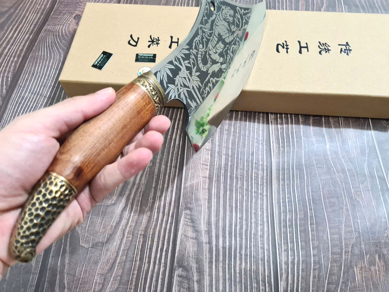 - Chức năng: Chặt xương ống, chân giò, trâu bò - Kích thước: Lưỡi: 22cm, cán: 10cm, rộng: 10cm, dầy: 5ly, trọng lượng: 800g - Cán : Gỗ mun, Khâu đồng đỏ , chốt đinh