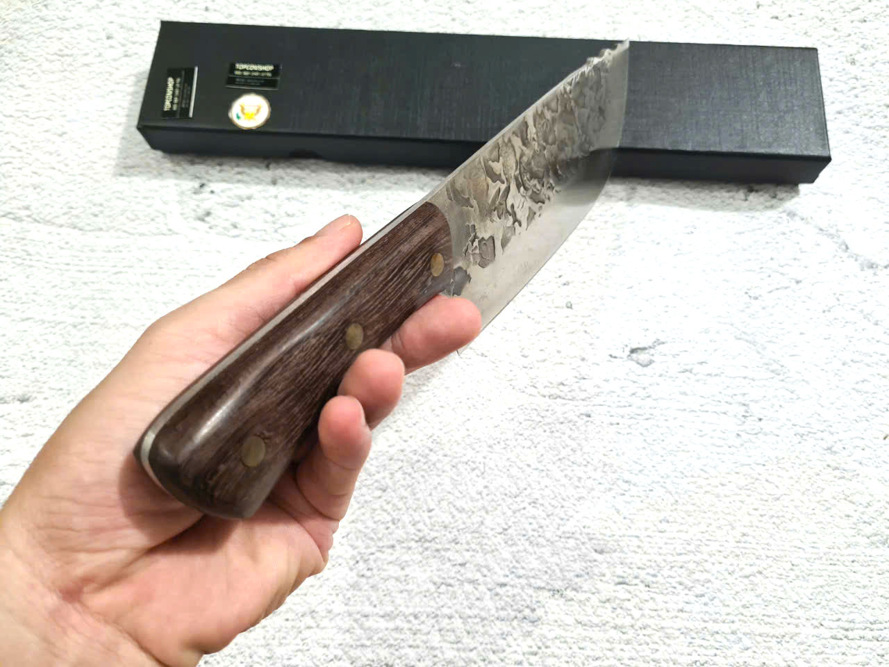 - Chất liệu: 100% thép nhíp ô tô được lựa chọn và kiểm duyệt kỹ càng. - Chất liệu cán: gỗ cẩm chỉ núi - Kích thước: lưỡi: 18cm, cán: 12cm, rộng: 6,5cm, dầy: 0,1,