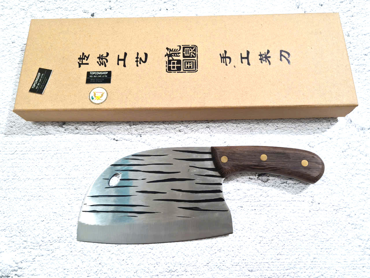 - Chức năng: Chặt xương ống, chân giò, trâu bò - Kích thước: Lưỡi: 22cm, cán: 10cm, rộng: 10cm, dầy: 5ly, trọng lượng: 800g - Cán : Gỗ mun, Khâu đồng đỏ , chốt đinh