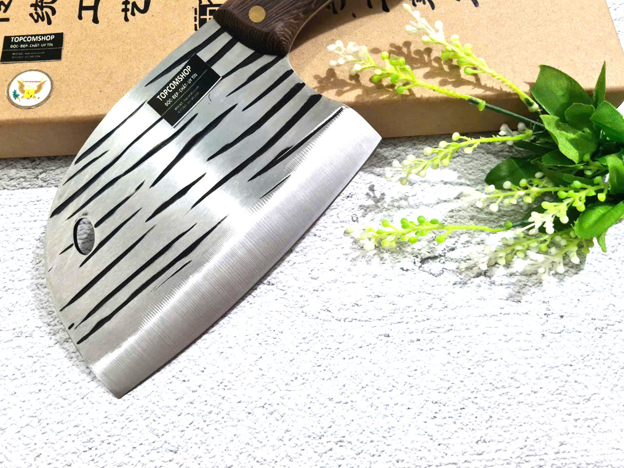 - Chức năng: Chặt xương ống, chân giò, trâu bò - Kích thước: Lưỡi: 22cm, cán: 10cm, rộng: 10cm, dầy: 5ly, trọng lượng: 800g - Cán : Gỗ mun, Khâu đồng đỏ , chốt đinh
