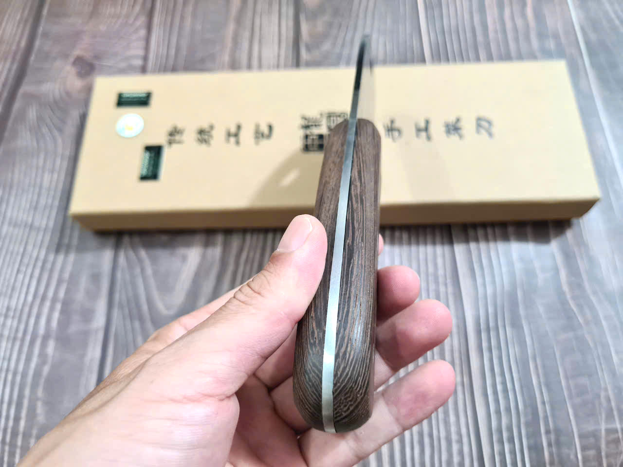 - Chức năng: chuyên chặt thái cá, chặt gà, lọ - Kích thước: Lưỡi: 26cm, cán: 12,5cm, rộng: 6,5cm, dầy: 4ly, trọng lượng: 480g - Cán : Gỗ mun , Khâu và chốt đồng đỏ
