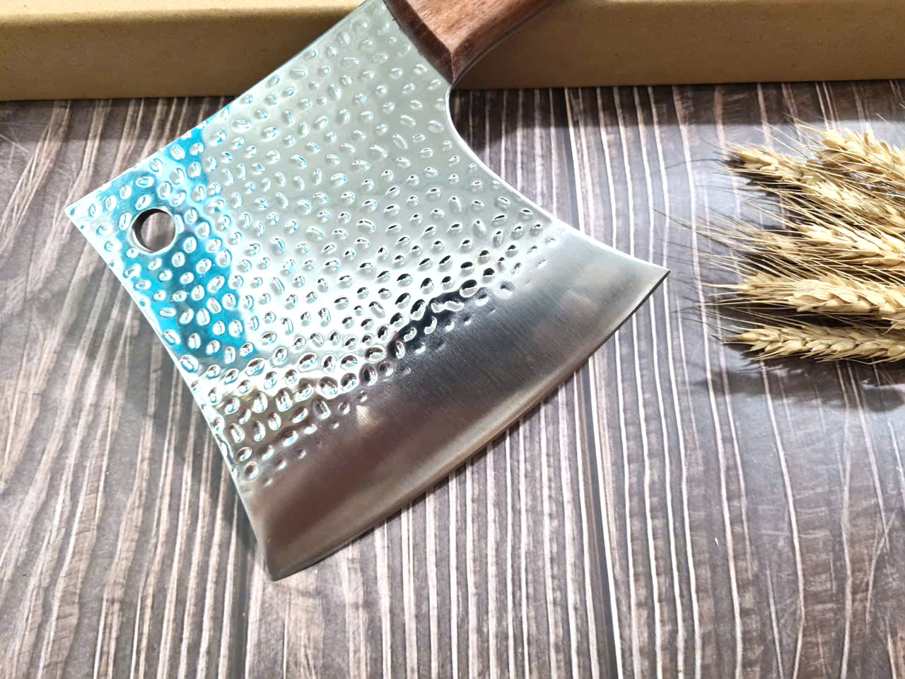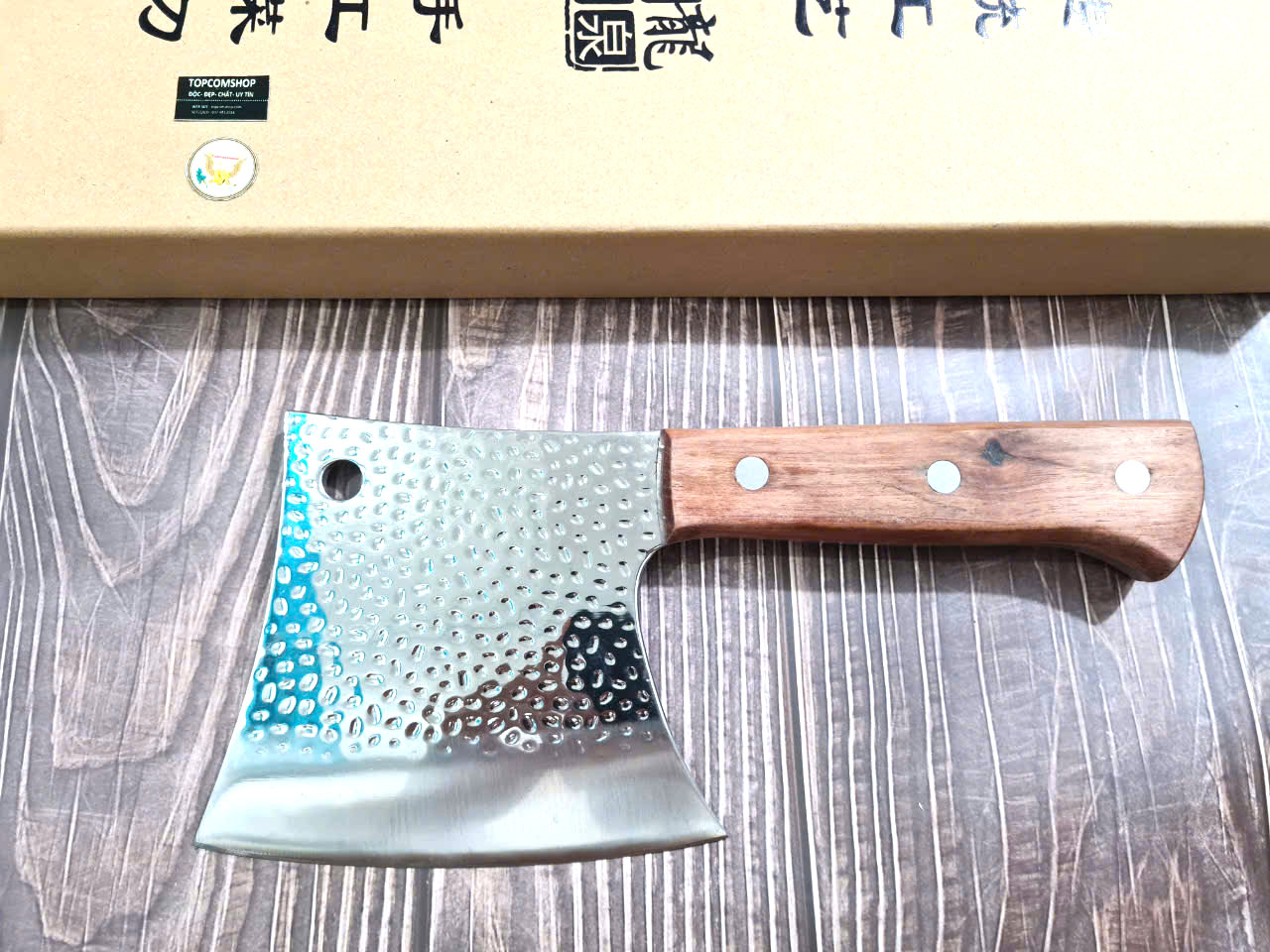 - Chức năng: Chặt xương ống, chân giò, trâu bò - Kích thước: Lưỡi: 22cm, cán: 10cm, rộng: 10cm, dầy: 5ly, trọng lượng: 800g - Cán : Gỗ mun, Khâu đồng đỏ , chốt đinh