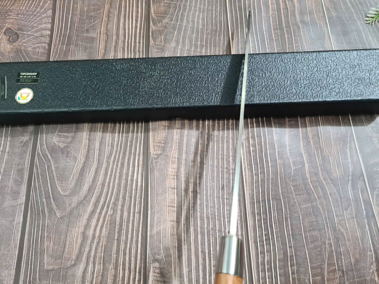 DAO BẾP SASHIMI MẶT HOA VĂN MÃ N4 THÔNG TIN SẢN PHẨM TỔNG DÀI : 45cm, LƯỠI: 30cm,RỘNG : 4cm, dày: 2.5mm, CHẤT liệu lưỡi: thép IFA cao cấp Chất liệu CÁN: gỗ Cẩm chỉ,