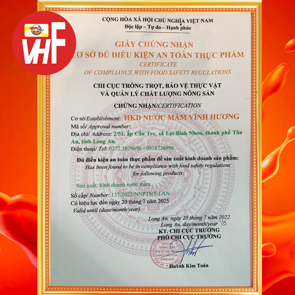 NƯỚC MẮM VĨNH HƯƠNG - 70 NĂM SẢN XUẤT NƯỚC MẮM THEO QUY TRÌNH CÔNG NGHỆ CỔ TRUYỀN Địa chỉ: 2/51 quốc lộ 62 , ấp Cầu Tre , xã Lợi Bình Nhơn , Tp Tân An , Long An