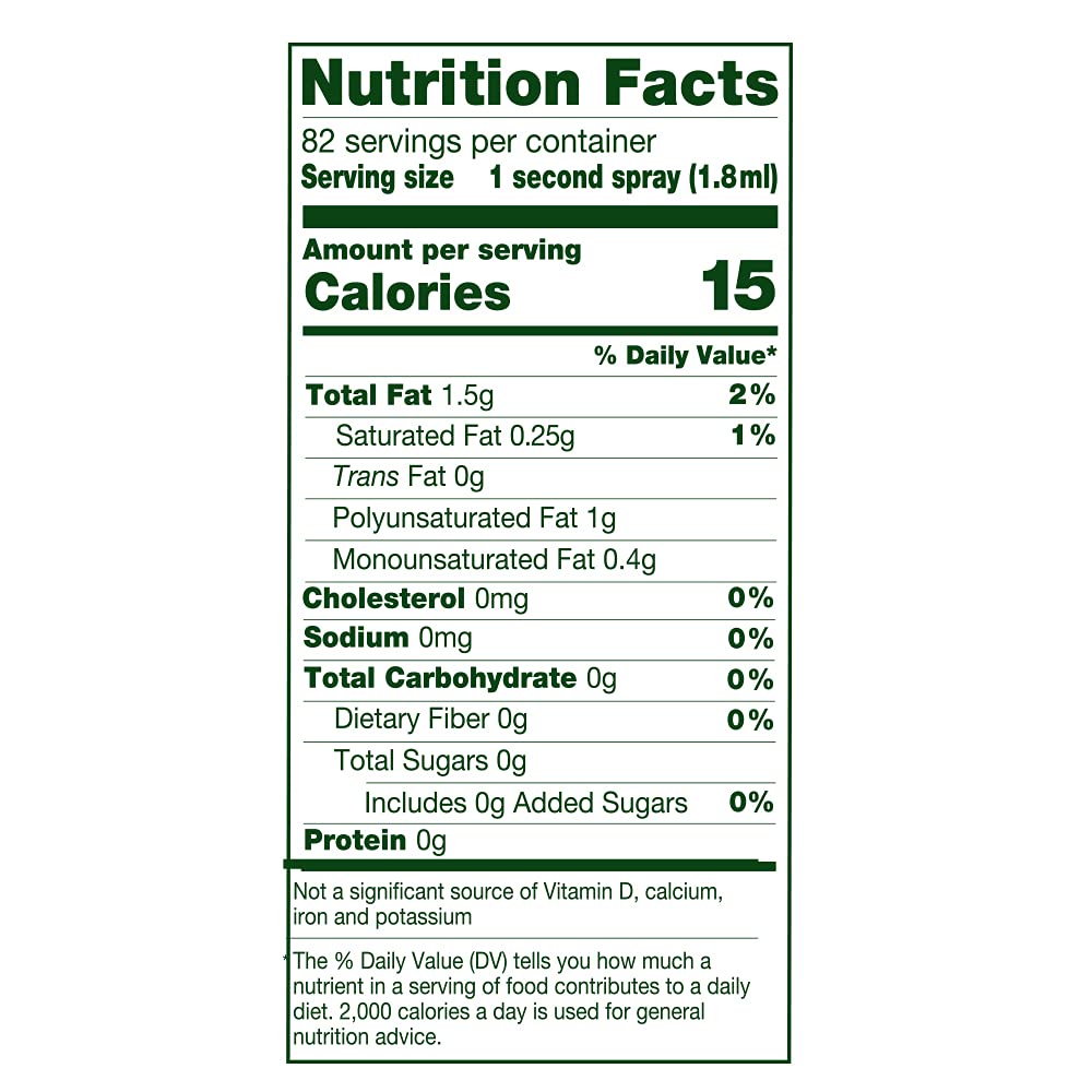 Thành phần cấu tạo: Dầu hướng dương giàu a-xit oleic (50%), dầu bơ (30%), dầu gạo (20%). Chỉ tiêu chất lượng: Xem trên nhãn chính Hướng dẫn sử dụng: Xịt một lớp dầu mỏng lên