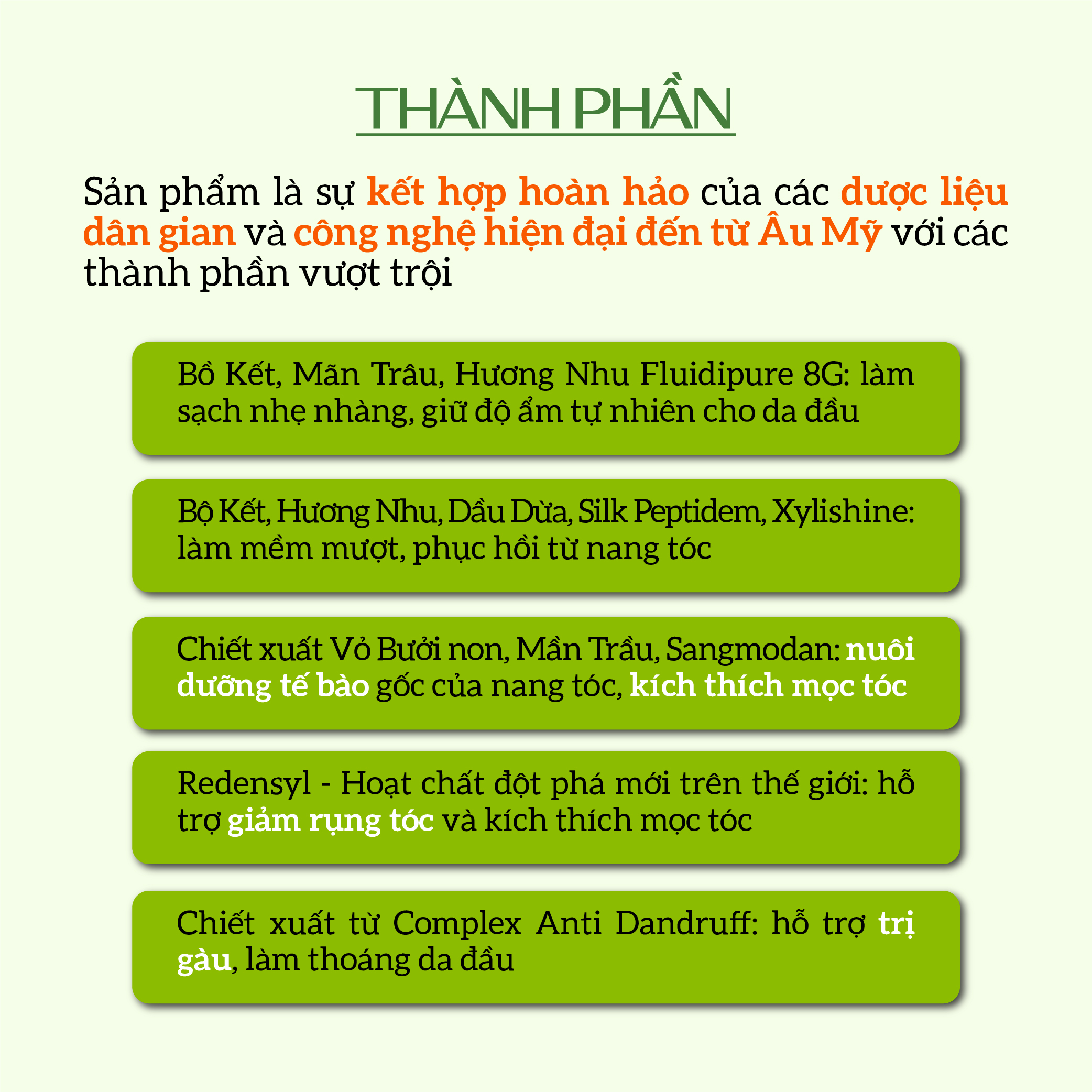 Thành phần: Chiết xuất từ cỏ màn trầu, chiết xuất bồ kết, hà thủ ô, dầu macadamia, tinh dầu bưởi, tinh dầu gừng, tinh dầu tràm trà, tinh dầu bạc hà, tinh dầu sả chanh,