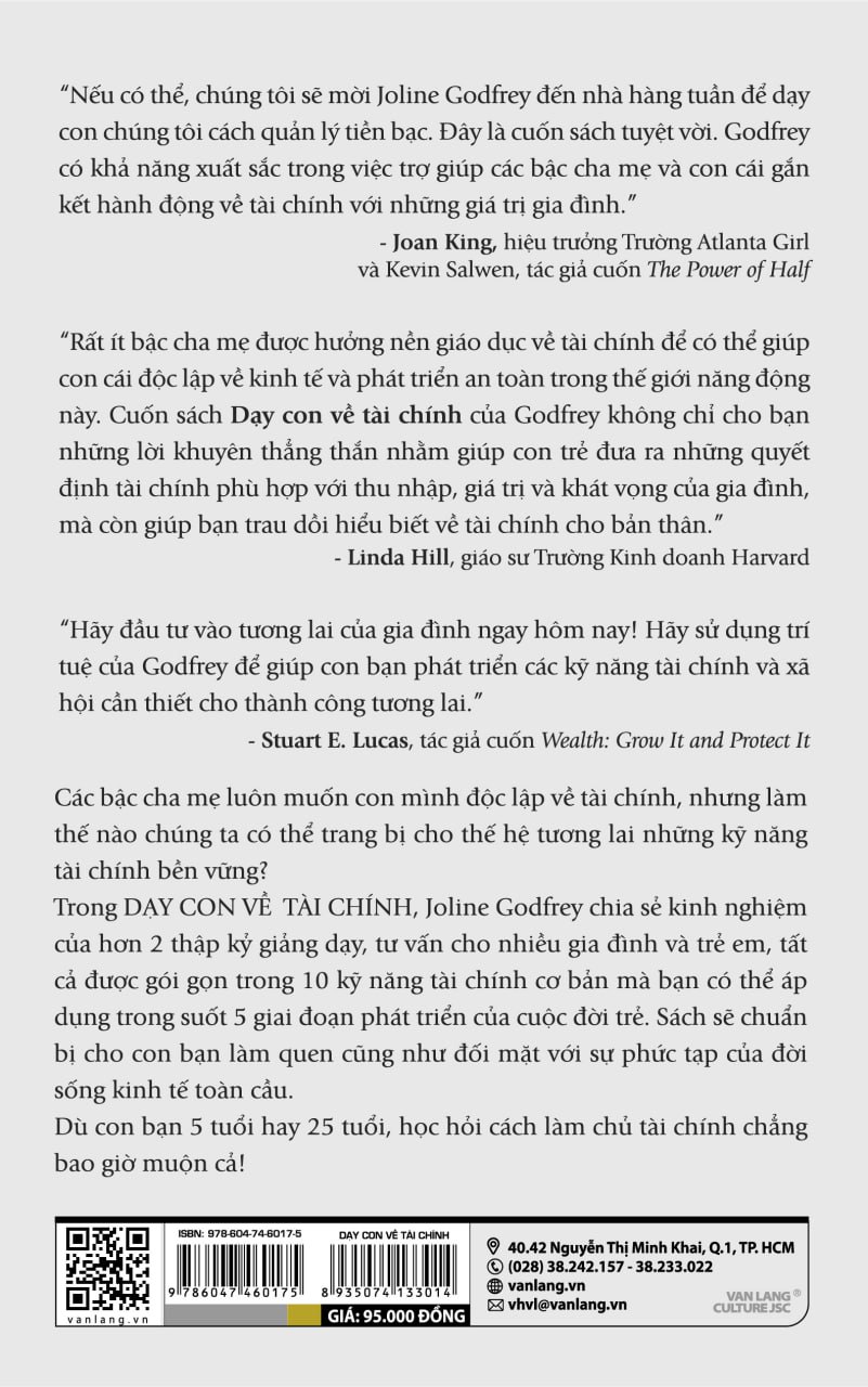 • Stuart E. Lucas, tác giả cuốn Wealth: Grow It and Protect It Các bậc cha mẹ luôn muốn con mình độc lập về tài chính, nhưng làm thế nào chúng ta có thể trang bị cho thế hệ tương lai những kỹ năng tài chính bền vững? Trong Dạy con về tài chính, Joline Godfrey chia sẻ kinh nghiệm của hơn 2 thập kỷ giảng dạy, tư vấn cho nhiều gia đình và trẻ em, tất cả được gói gọn trong 10 kỹ năng tài chính cơ bản mà bạn có thể áp dụng trong suốt 5 giai đoạn phát triển của cuộc đời trẻ. Sách sẽ chuẩn bị cho con bạn làm quen cũng như đối mặt với sự phức tạp của đời sống kinh tế toàn cầu. Dù con bạn 5 tuổi hay 25 tuổi, học hỏi cách làm chủ tài chính chẳng bao giờ muộn cả!"